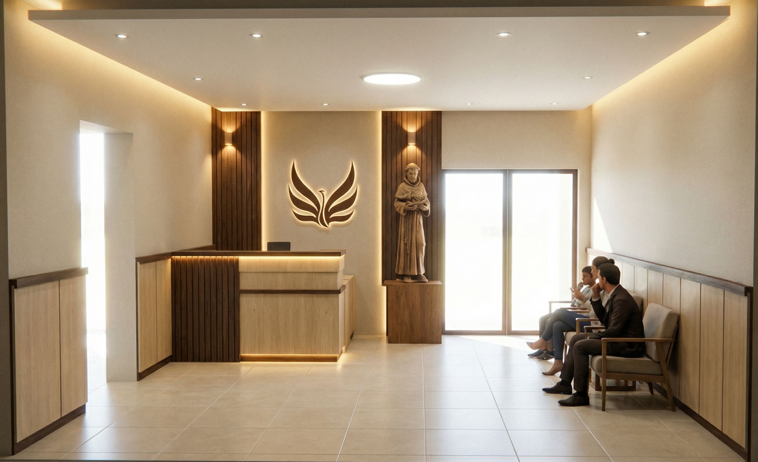 Generar render de alta calidad de la recepción y hall de espera del colegio Carmelo. Mantener los colores originales, los materiales son: el piso es porcelanato matte de color claro de 0.60x0.60 cm. Las paredes tienen los zócalos como se muestra en la imagen, el materiales madera clara con tiras de madera oscura en los bordes superiores y contrazocalos. En la pared del fondo se tienen dos wall panels de madera oscura verticales de piso a techo, en cada uno de ellos hay un aplique de luz calida de acento que la luz apunta hacia abajo. En el centro de la pared del fondo, entre ambos wall panles está la insignia del colegio el carmelo que es retroiluminada por detrás con luz calida. El mueble de recepción es en general de madera clara, la misma madera del zocalo, y tiene detalles de madera oscura horizontales, ademas tiene tiras de luces led horizontales de acento que salen de la parte superior y del zocalo del mueble. El techo tiene un cielo raso color blanco con dicroicos que dan luz neutra y una luz central principal neutra, en los laterales tiene tiras de luz led calida que baña ambas paredes laterales. Todo el resto de pared es de color blanco lino beige clarito. Es importante mantener el santo que está sobre un podio de madera. el hall de personas esperando solo está a la pared de la derecha., keep exact camera angle