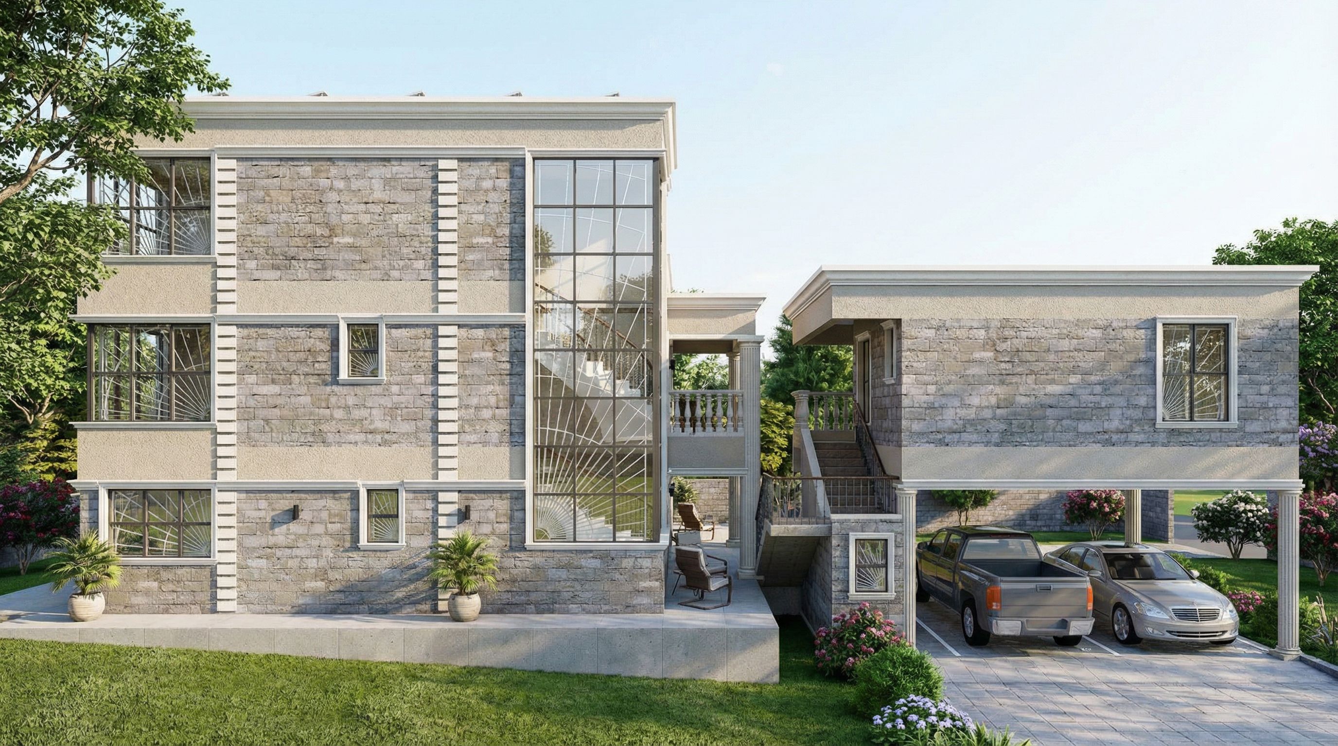 Promptarchitectural exterior rendering, render this 3D mass into photorealistic rendering, Create a bright daytime photorealistic exterior render of a three-storey stone-clad residence with classical detailing. The house features light beige textured plaster bands, grey stone walls, and prominent cornices and mouldings. , keep exact camera angle, bright daylight, natural lighting, including greenery and vegetation, high quality, professional, detailed scene