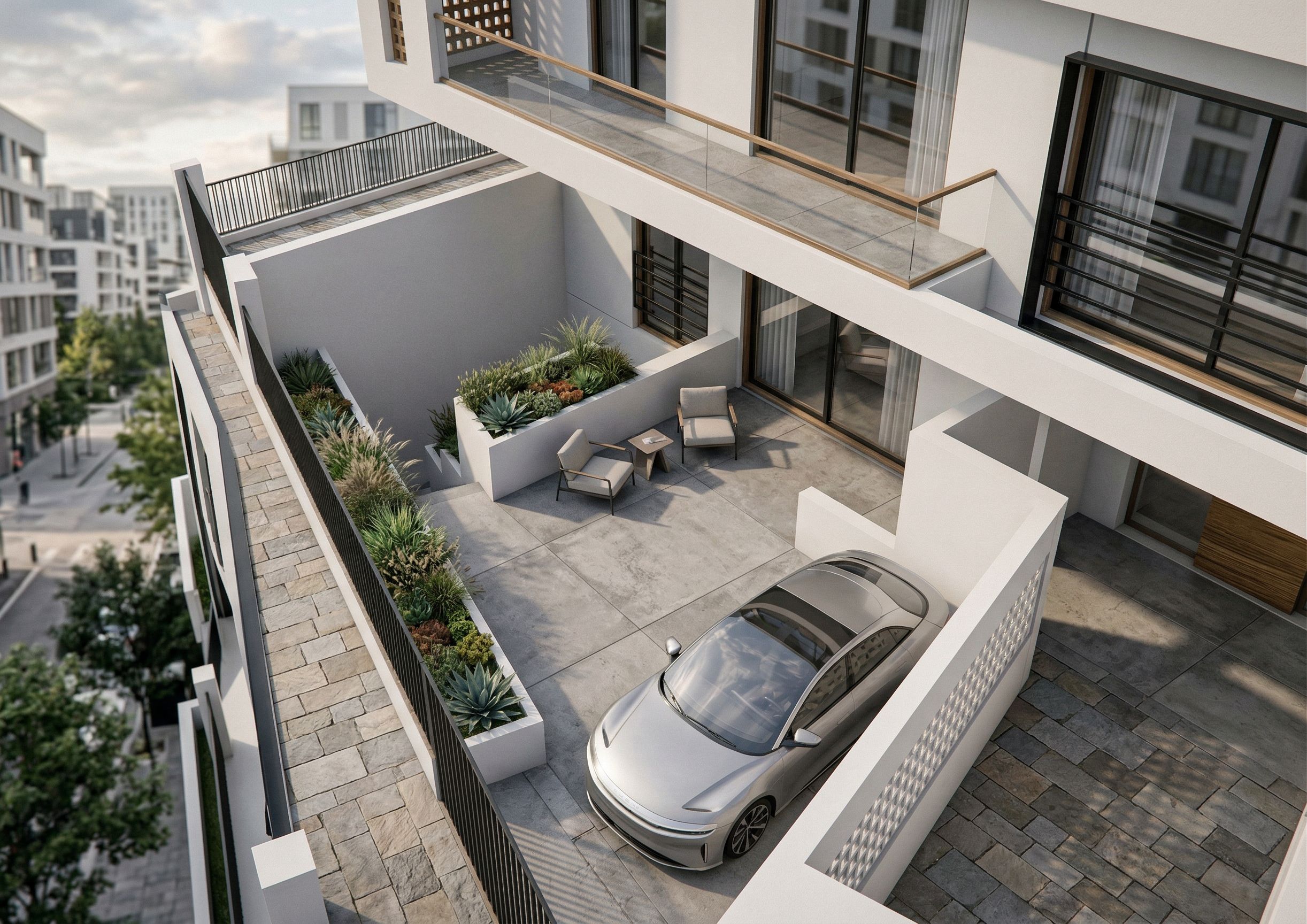 PromptPhoto of a contemporary residential building featuring clean lines and minimalistic design. Highlight the smooth white exterior walls, large glass windows, and wooden balcony railings. The surrounding urban environment includes a small grassy courtyard and sleek fencing and add a car in front of the window. , keep exact camera angle