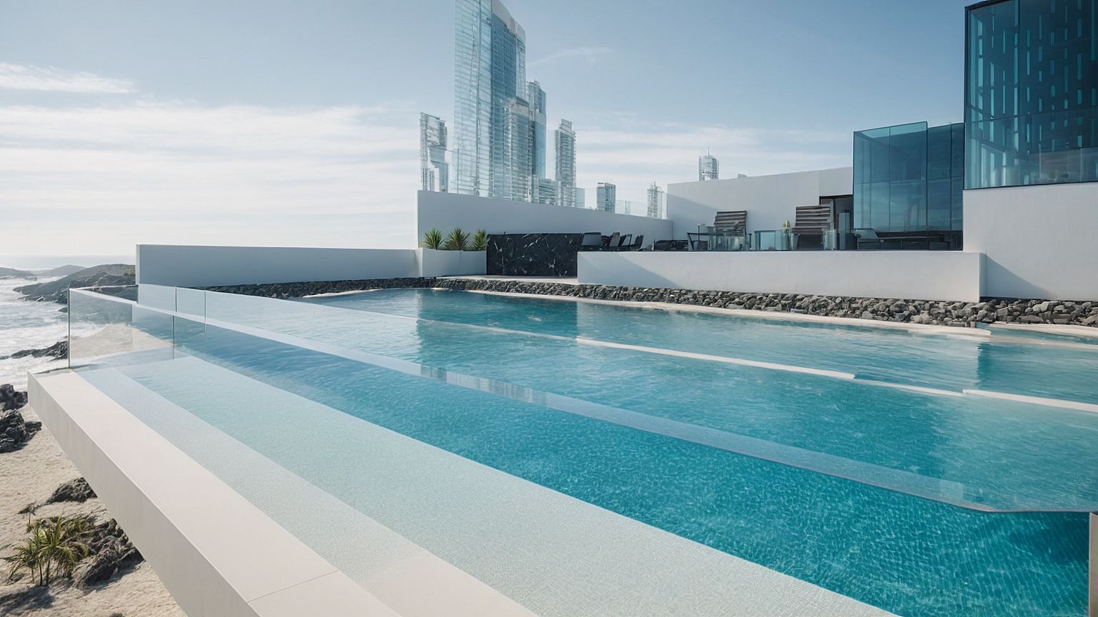 more realistic - focus on the infinity pool and after that there is a glass railing - there is a beach after the glass railing