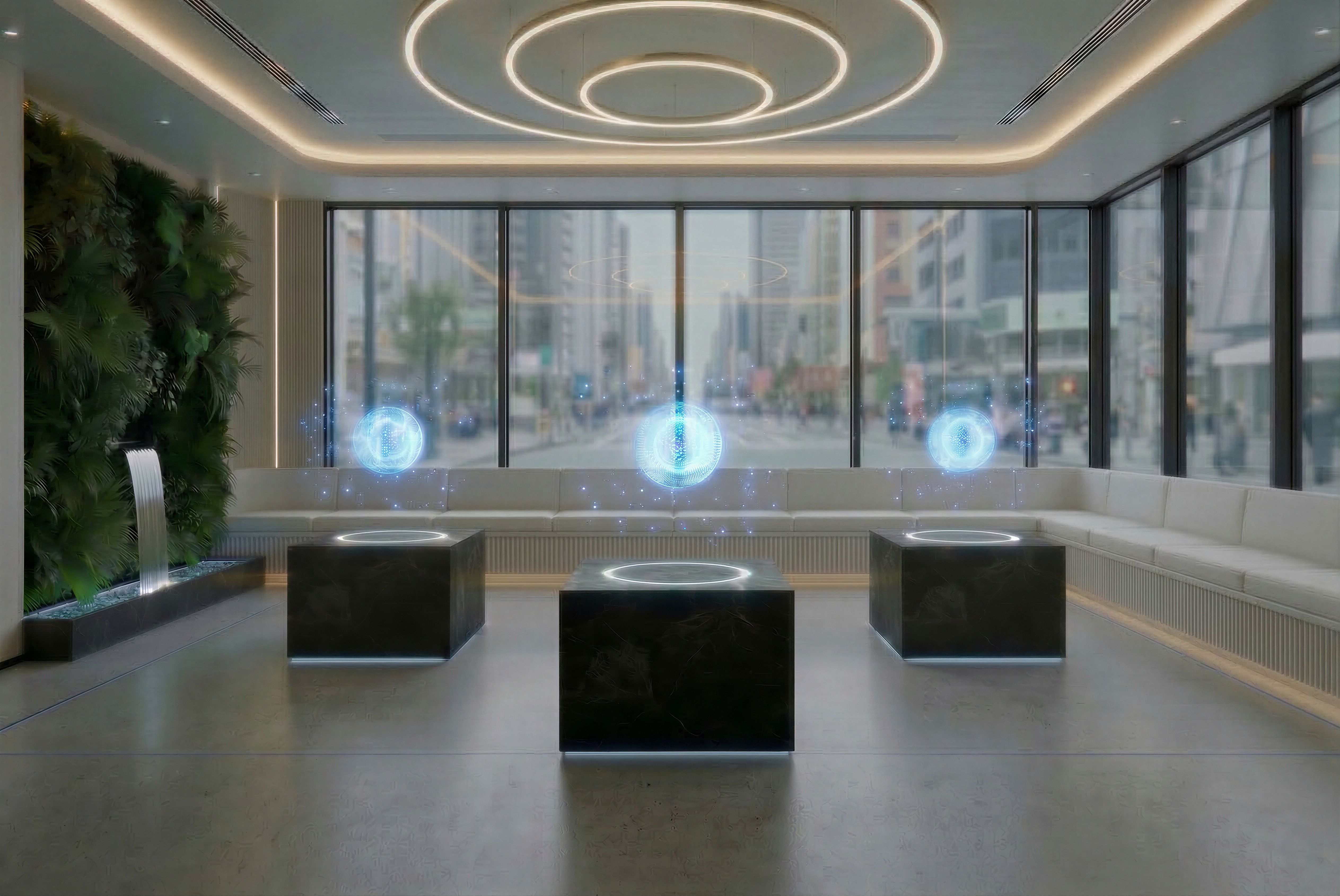 EnhancedPromptDim the large windows by applying a light translucent tint or smart glass effect. The street outside should still be visible but diffused and still a bit muted, reducing brightness inside the space in half. Lower the overall daylight intensity so the interior feels more controlled and private. At the same time, enhance the visibility of the holograms by increasing their glow and contrast slightly. Maintain a balance where the interior feels atmospheric and immersive, but the exterior is still readable from both inside and outside. Keep everything else unchanged, keep exact camera angle