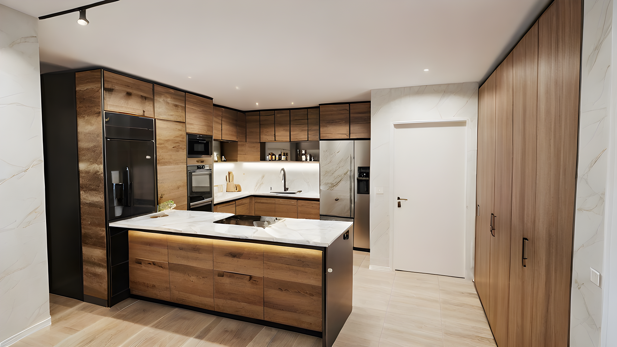 kitchen with marble and wood and a fridge of steel