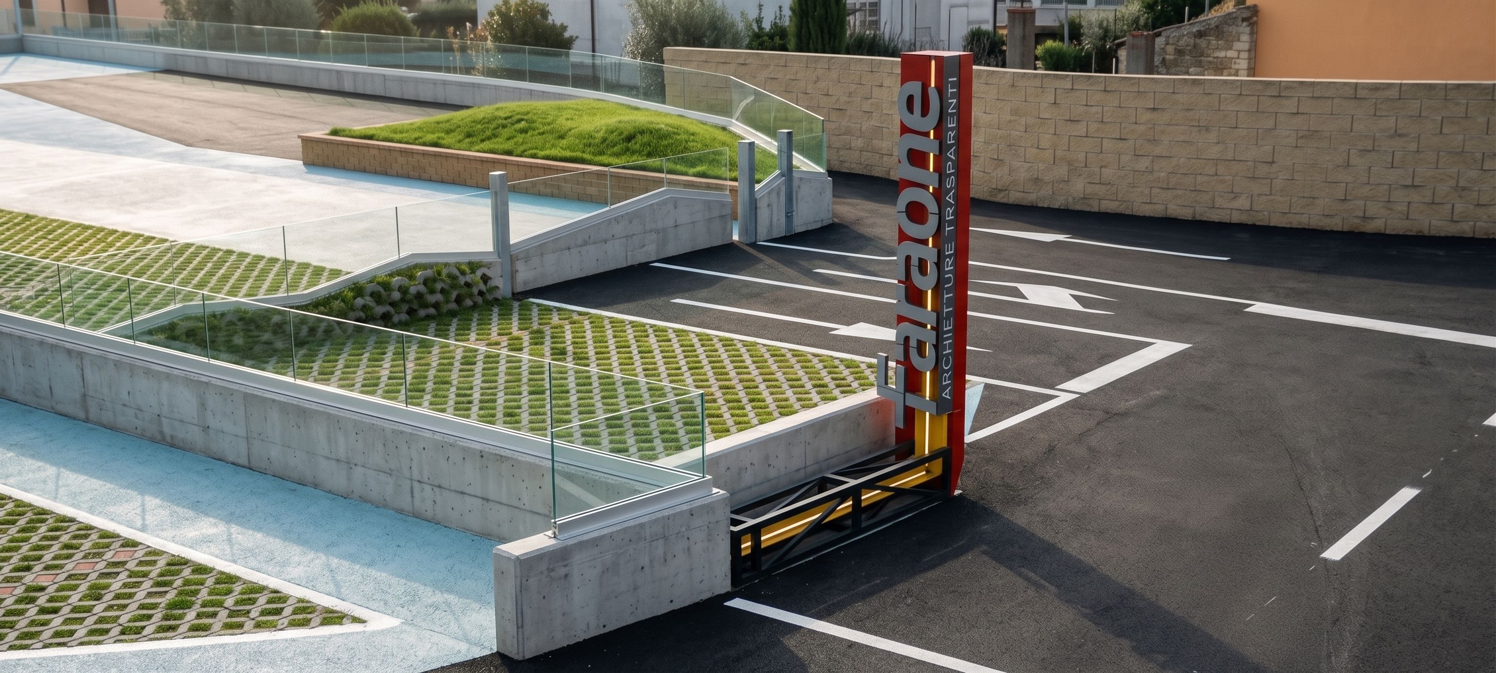 Promptinsert photorealistic materials into this outdoor space image. The purple surfaces are dark asphalt with white lane and traffic lines; the dark blue surfaces are in permeable paving like 'green park' as shown in the model in reference image1; the red fence walls are in smooth exposed concrete; above the walls there is a transparent glass railing with an aluminum profile underneath it as a fastening to the wall; the light blue surface is a brushed light concrete pavement; the orange wall is made of sand-colored stone blocks, like the wall in reference image2; the totem with the 'faraone' logo in gray in a vertical orientation is made of red metal; the yellow structure is a black metal structure with a strip LED running along the center of the metal profile and illuminating from behind the vertical sign., keep exact camera angle