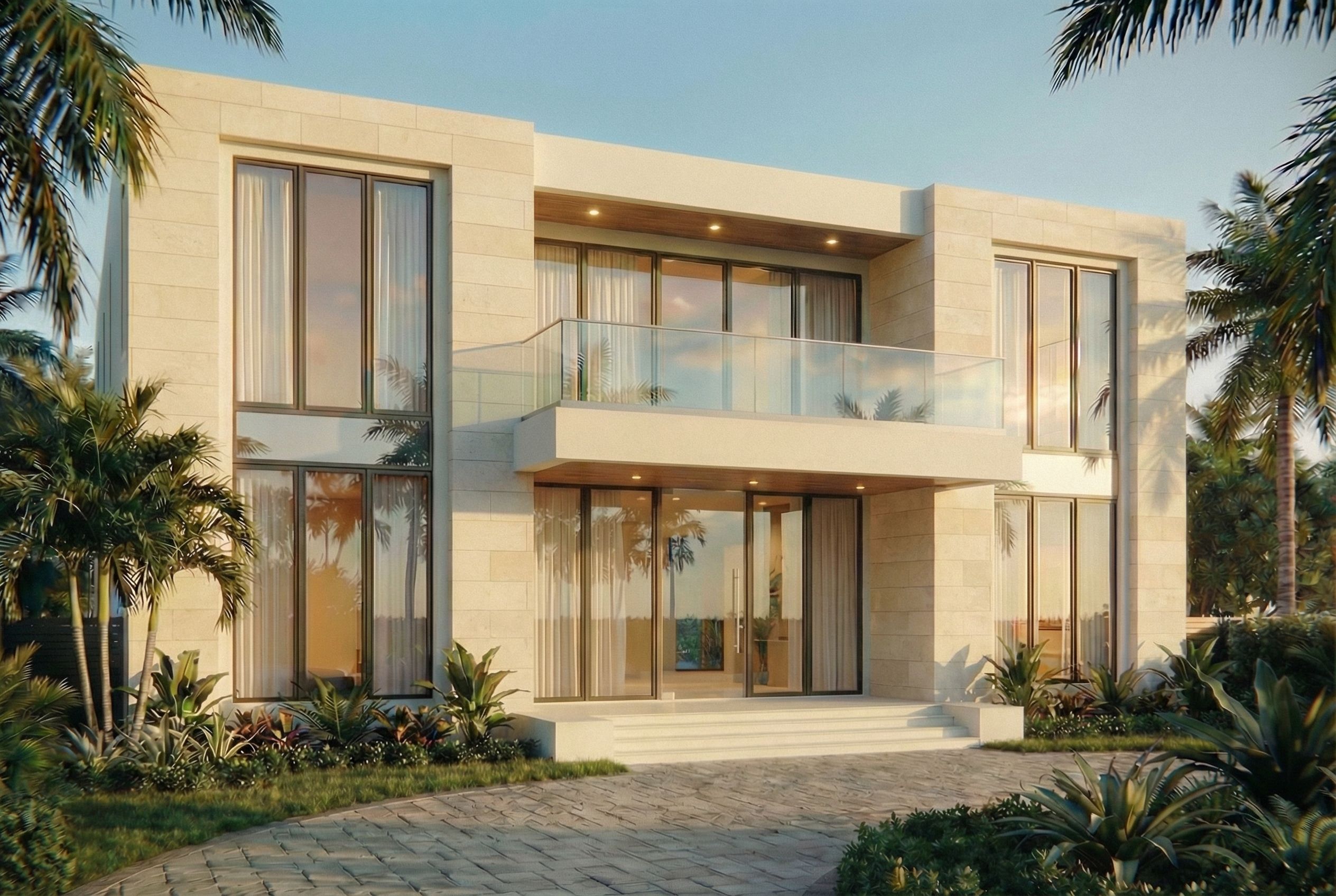 Render Studio AI Prompt Front Perspective Edit: Create a photorealistic, cinematic front perspective render of the provided modern Regency / South Beach Miami style residence in Palm Beach, Florida. Maintain the exact massing, proportions, window sizes, and overall architectural composition of the original image. Do not alter the rooflines, window locations, balcony width, or floor-to-floor heights. Apply ONLY the following changes: Replace the existing front entry door with a full-height clear glass door with minimal framing frameless or very thin metal frame. On the two flanking side massings left and right wings, replace the stucco wall finish with light limestone stone cladding with clean, horizontal coursing. horizontal coursing only. horizontal coursing spaces at 2'. Remove the front columns at the loggia. Make the balcony fully cantilevered with no vertical supports below. The ONLY stucco elements should be: The soffit / overhead roof plane above the balcony The vertical faces of the balcony slab the vertical face above the windows that is the same width as the roof over/ the soffit area above the windows. Material + Rendering Quality: Ultra-photorealistic architectural photography Cinematic, soft golden-hour lighting High-end luxury residential photography look Realistic glass reflections and refraction Natural palm landscaping, Palm Beach context Clean shadows, physically accurate materials Sharp focus, DSLR-quality depth and clarity Negative Prompt important to include if possible: Do not change the architecture, do not add columns, do not add extra windows, do not modify massing, do not enlarge openings, do not add arches, do not change style, no elevation view, no aerial view. , keep exact camera angle