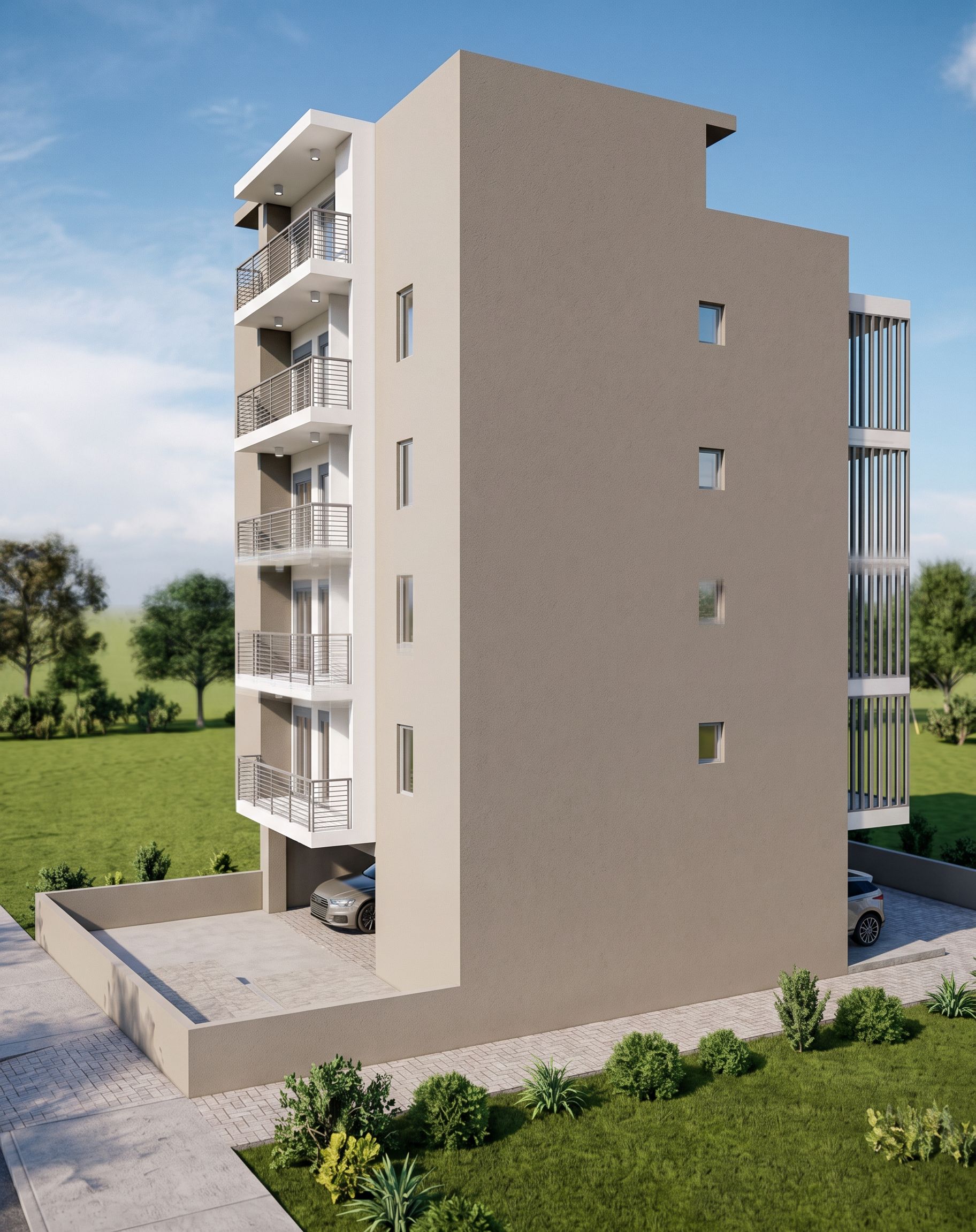 PromptBuilding in grey beige pal tone with white balconies with gray railings in balconies and grammical white spot light in balconies.More realistic. , keep exact camera angle