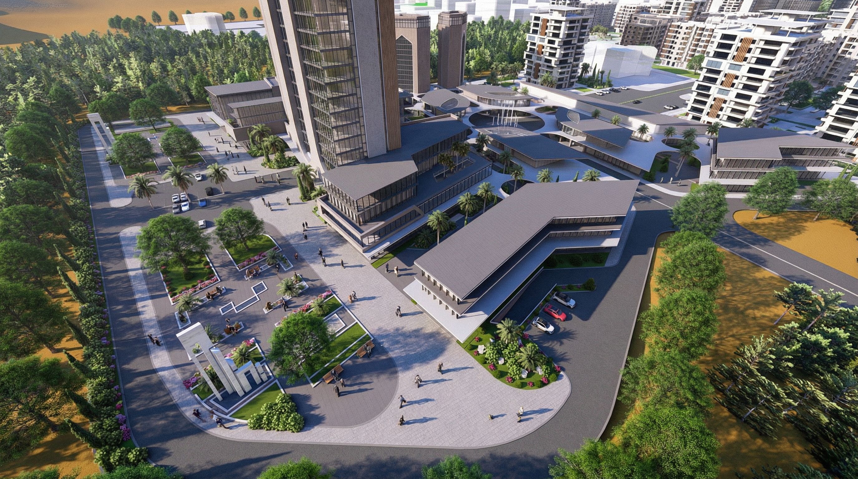 Promptthis is a scene of a public park for the employees of the buisness center towers and offices ... enhance the materials and make it super realistic add people, keep exact camera angle