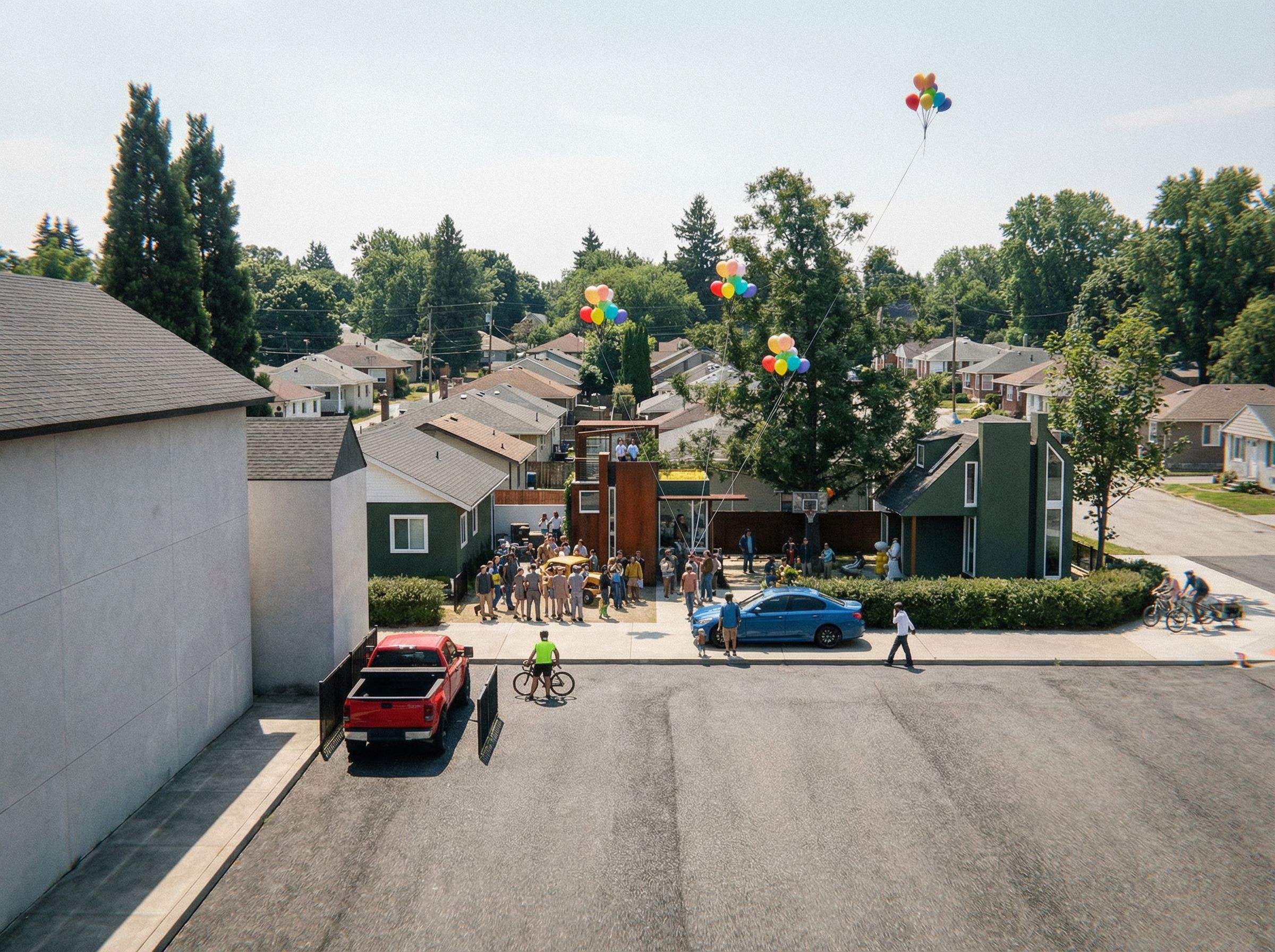 Promptmodern, smooth rusted steel vertical walls, dark green stucco walls, white window frames with trees and single storey low bungalows parallel in background, keep exact camera angle