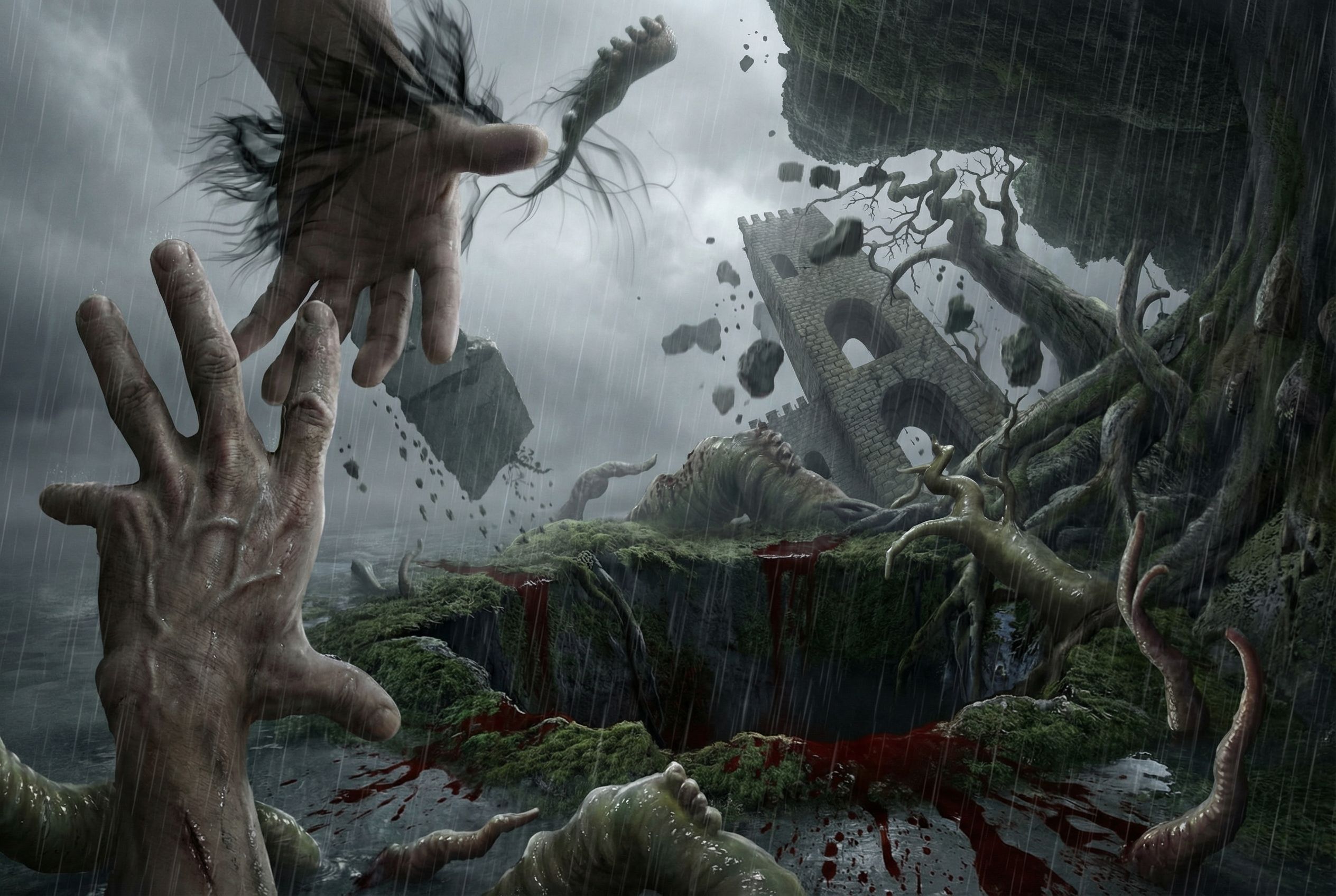 architectural exterior rendering, render this sketch into photorealistic rendering, CREATE A MORE REALISTIC IMAGE OF THIS IMAGE; ADD BLOOD AND MOSS IN THE HOLE; ADD RAIN., keep exact camera angle, overcast day with diffused lighting, high quality, professional, detailed scene