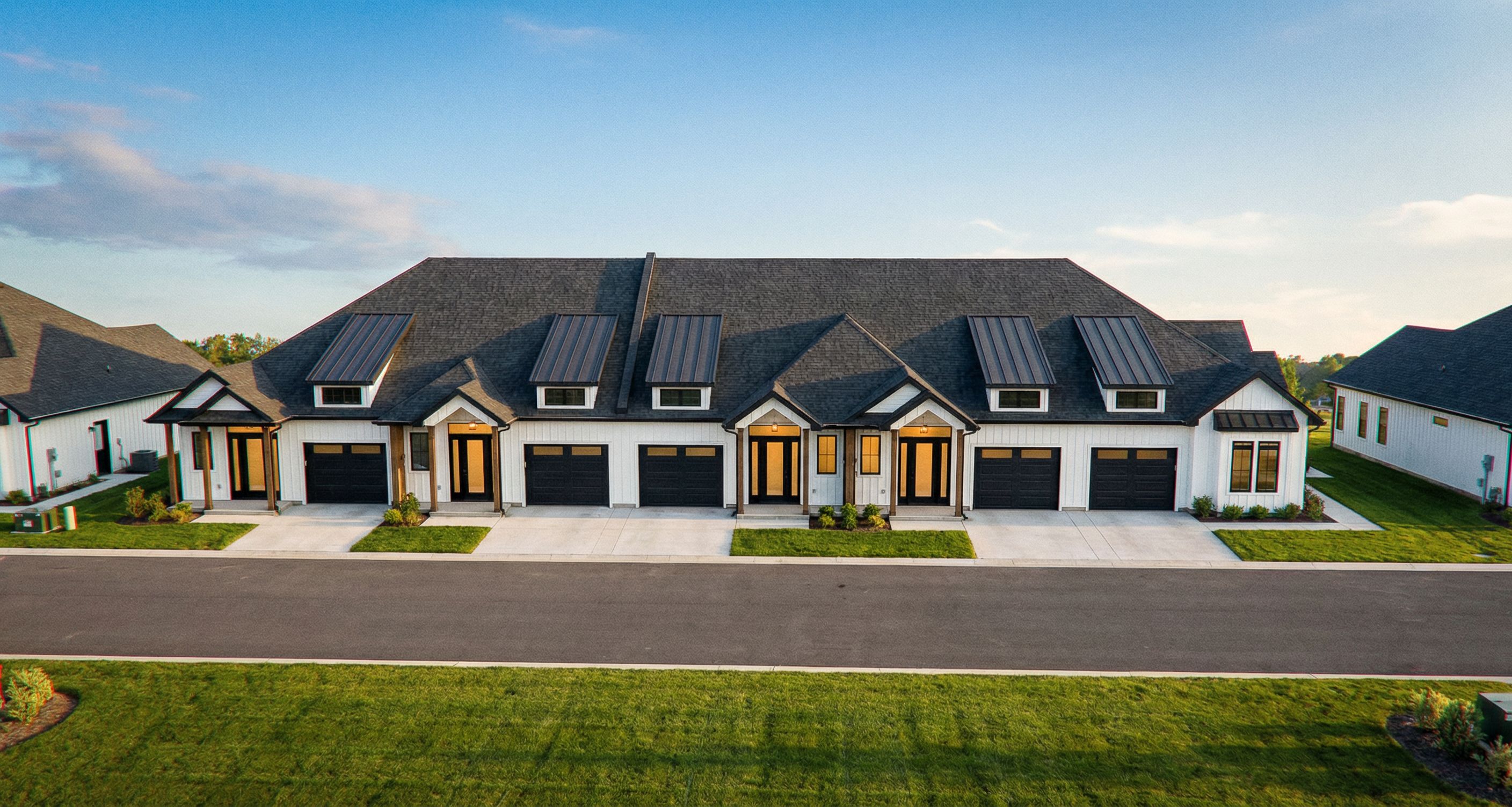 PromptPhoto of a modern duplex residential building featuring clean lines and a balanced facade. Emphasize the use of white siding contrasted with dark roofing, complemented by sleek black garage doors. The surrounding landscape includes manicured grass and a paved driveway. Natural daylight illuminates the structure, creating soft shadows that accentuate architectural details. Captured at a slightly elevated angle with a wide-angle lens, enhancing the sense of space and emphasizing the arrangement of the units., keep exact camera angle