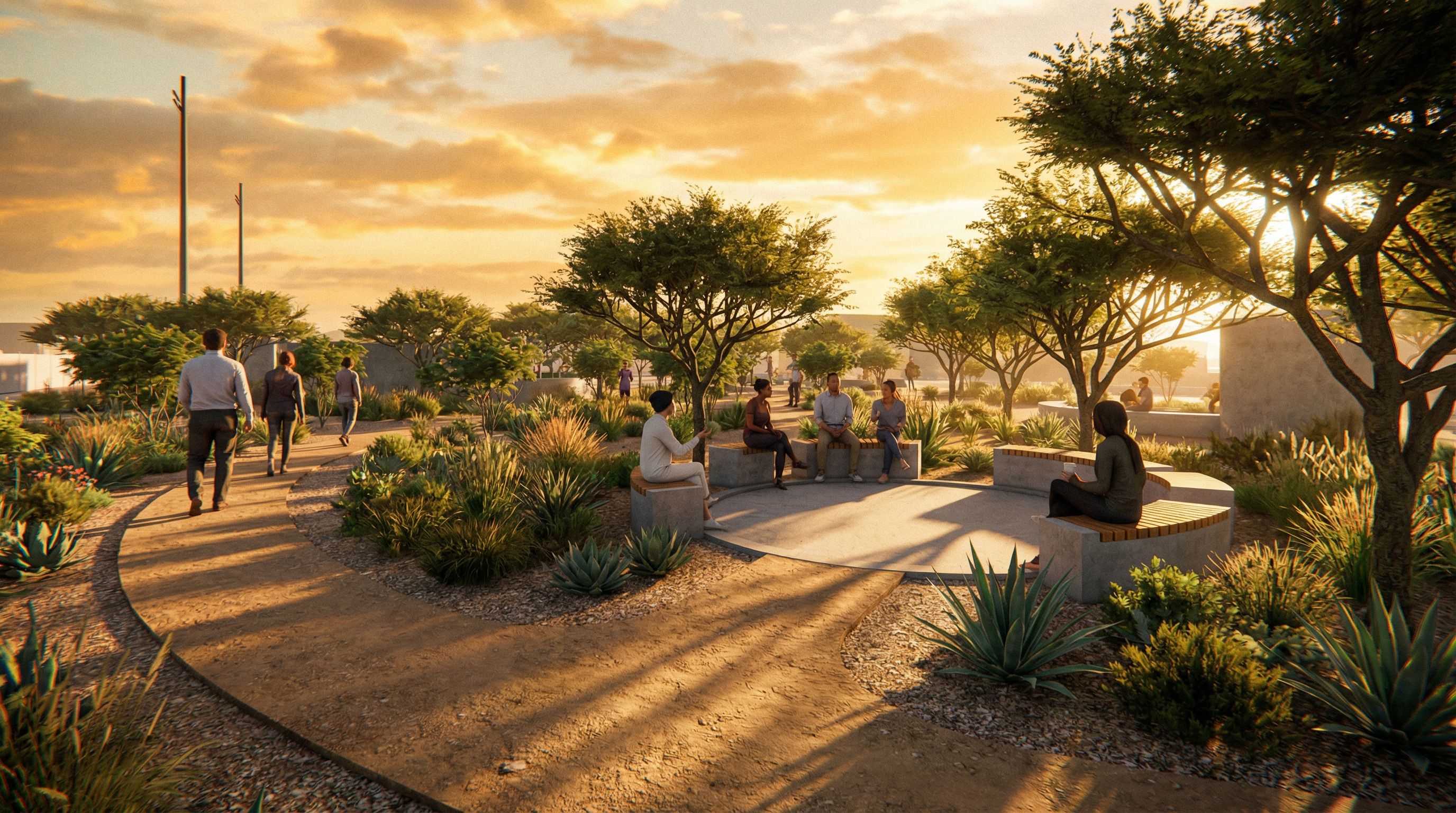 PromptTake the model shown and as is and add texure to the concrete walk, show a stabilized material and cast in place concrete seatwalls use tree forms of the desert and some groundcover plantings , keep exact camera angle