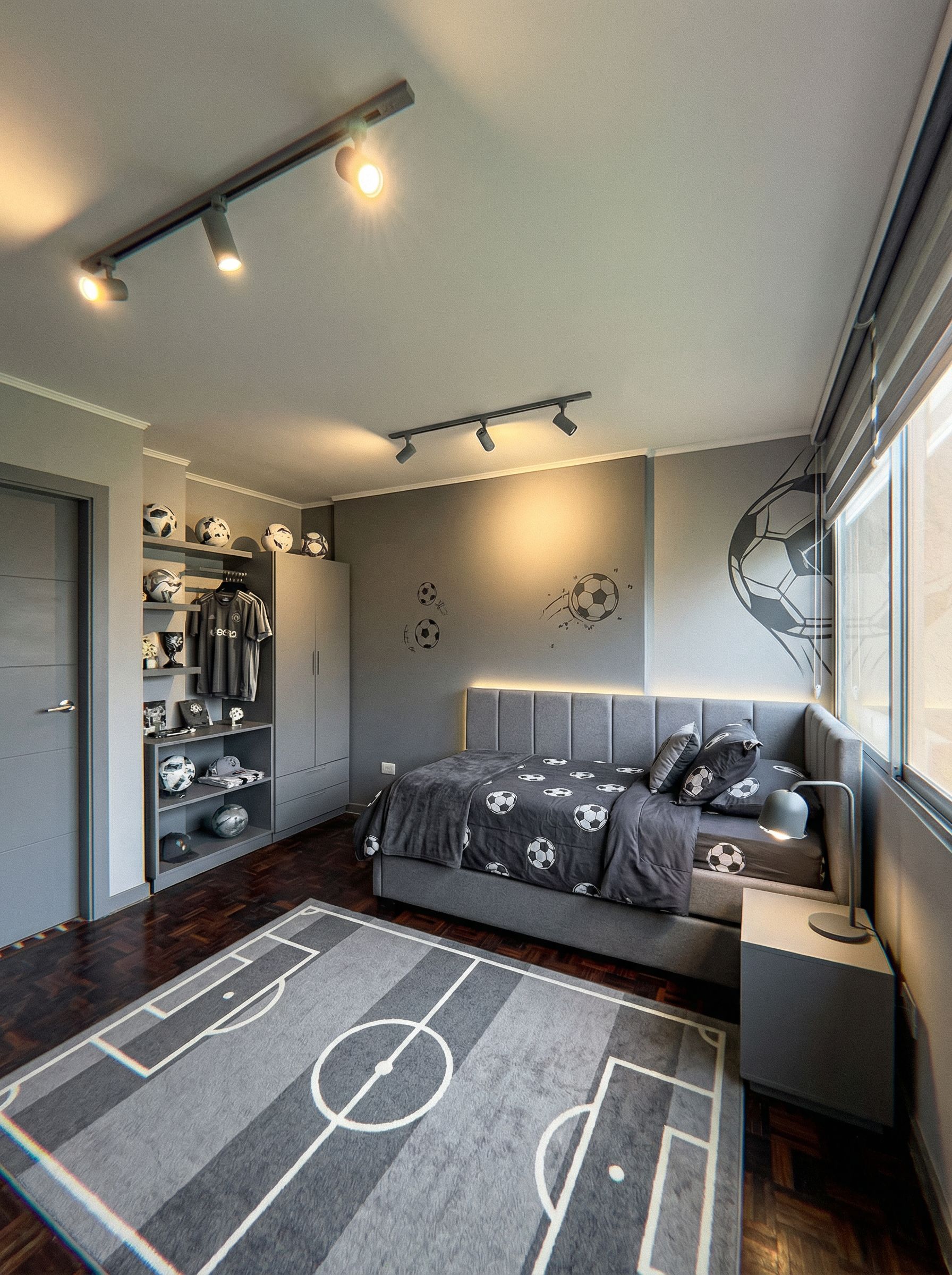 ayudame a diseñar en esta habitacion, un dormitorio para un niño que es fanatico del futbol en color monocromaticos de tonalidades grises y hacer una propuesta de iluminacion moderna, keep exact camera angle