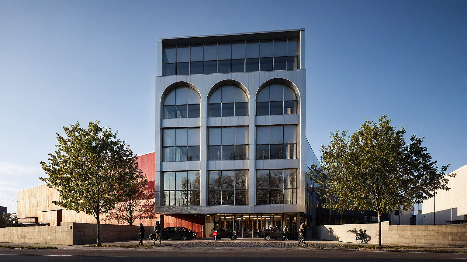 photography, dynamic view, modernism mid-scale store facade design, Canon EOS 5D Mark IV, EF 24mm f/1.4L II USM lens, set f/2.8 for a depth of field that highlights architectural photography, design should blend different materials in a way that’s both innovative and aesthetically pleasing, focus on a clean composition, with sharp lines and a balanced interplay between light and shadow, archdaily style, hight contrast, highlight the facade’s details and textures, like the unique patterns in the materials or the play of light through the windows, to evoke a sense of depth and realism, with an emphasis on the facade as the focal point of the composition, night, some people silhouette, car taillights, lens flare effect, photorealistic, detail of the facade’s design and materials --no unreal scale --ar 9:16 --style raw --stylize 750 --v 6