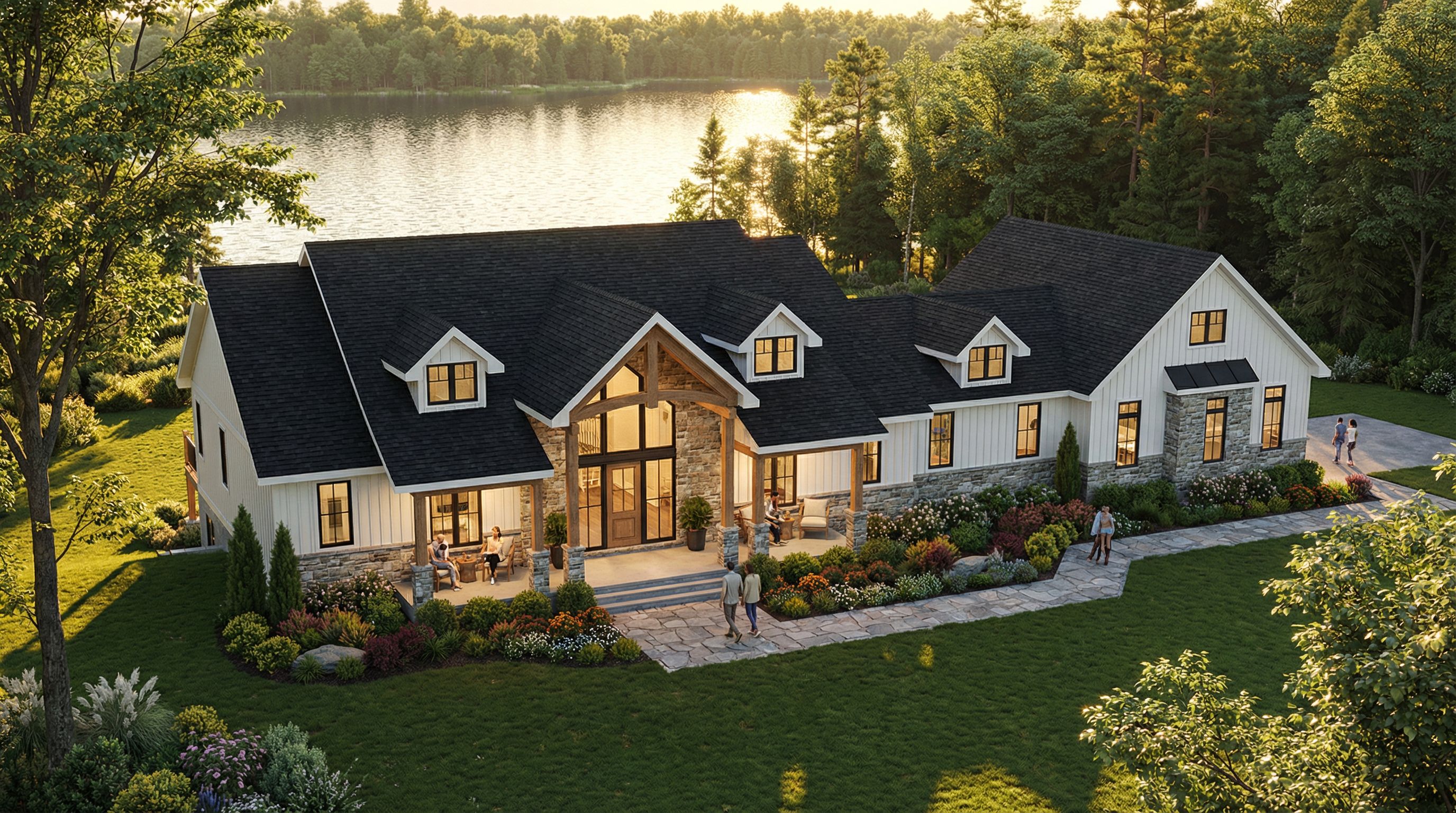 architectural exterior rendering, render this 3D mass into photorealistic rendering, modern craftsman style home, white siding, black shingle roof, lush landscaping, featuring a lake in the background in a wood setting, sun reflecting off the water, keep exact camera angle, golden hour warm lighting, including people, greenery and vegetation, trees, high quality, professional, detailed scene