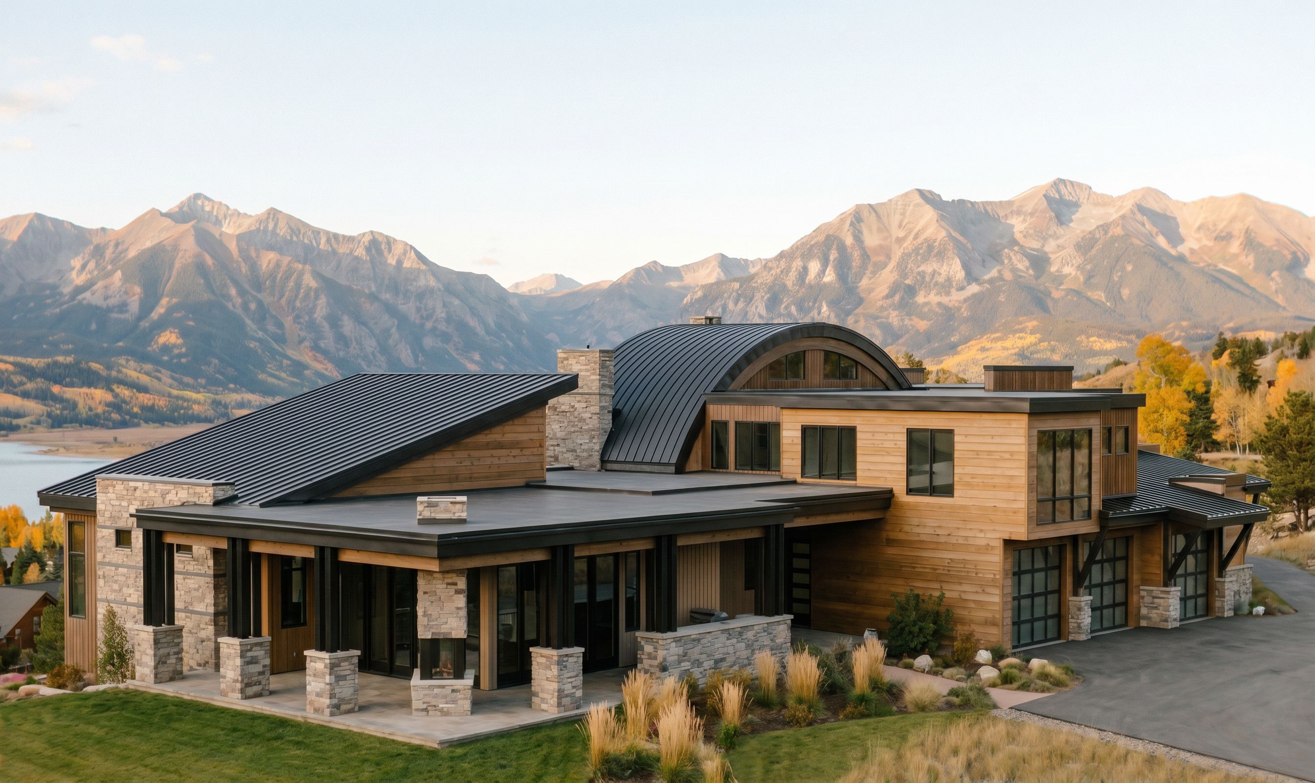 LOWER THE POINT OF VIEW SO YOU ARE NOT LOOKING DOWN ON THE HOUSE as its shown. i dont want to see so much of the flat roof so it should be more at human eye level and not looking down on the house. SAME marerials. make the horizontal wood have a little more pop and brightness. keep the BAckground and landscaping the same. do not show a driveway at the bottom of the image just continue the lawn. keep the driveway in front of garage as shown in the image. make the columns and brackets dark steel. at the right of the patio; do not show the railing at the porch continuing in front of the long stone kitchenette , keep exact camera angle