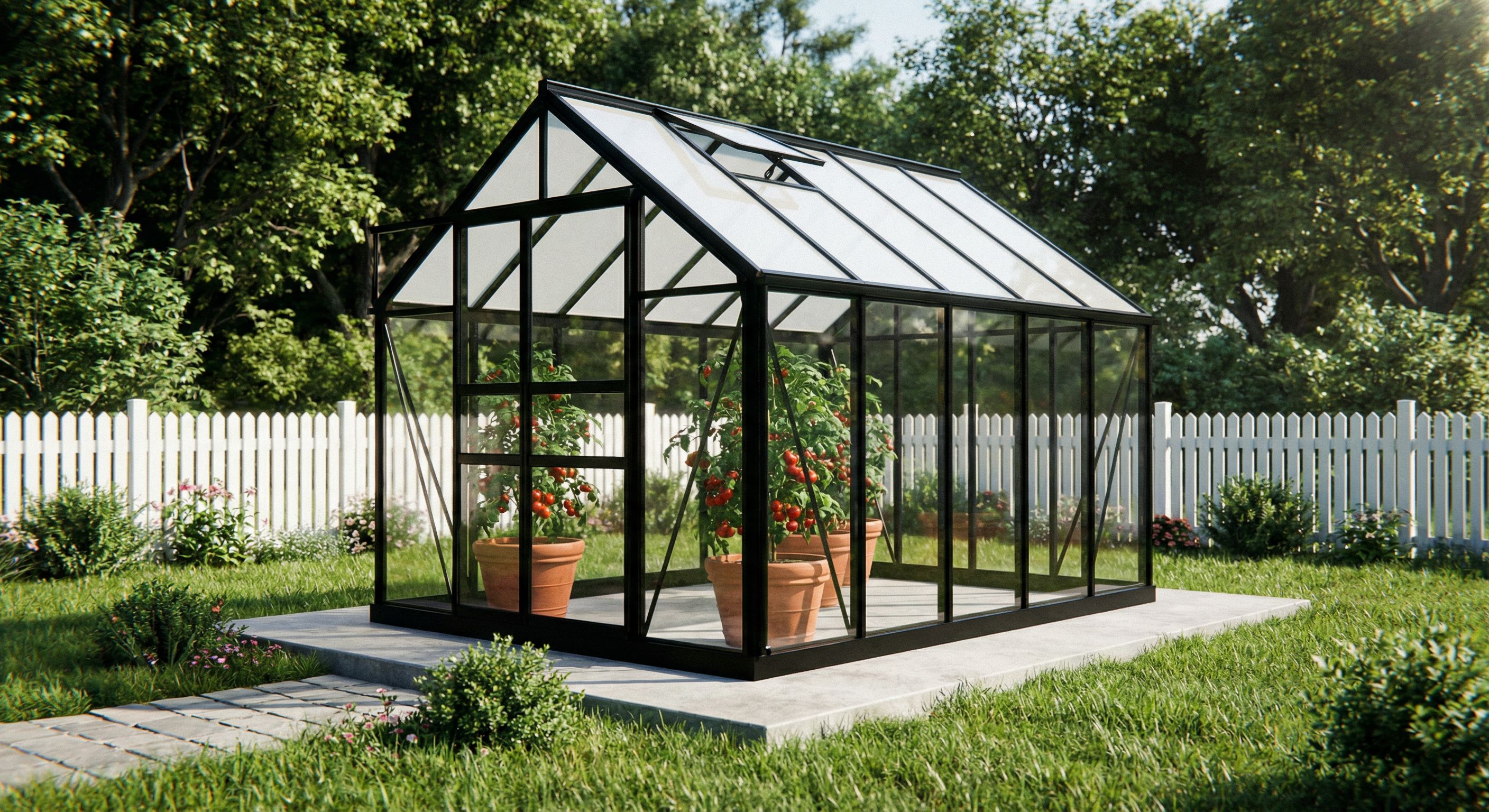 Can you optimize this visualization of a greenhouse so that it looks more realistic - both outside and inside? Fewer plants - I would like to two terracotta pots with tomato plants inside the greenhouse - not mare than two. Avoid white pots altogether. Optimizes and makes the whole thing more realistic. Roof glasses are tinted white. , keep exact camera angle
