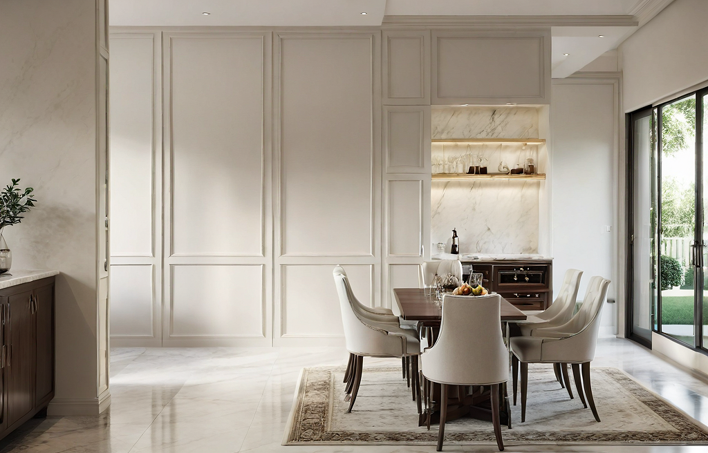 PromptAIRY CLASSIC AMERICAN DINING ROOM, WITH WHITE FLOOR AND AFGHAN RUG. MARBLE TABLE.