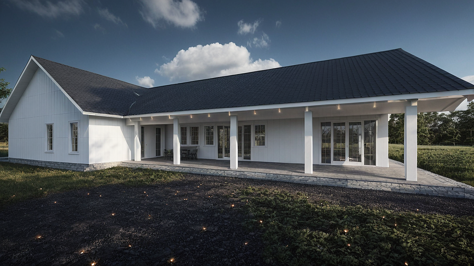 Promptdark grey farm house . white structure. white windows and door frame . dark Grey roof. lights.