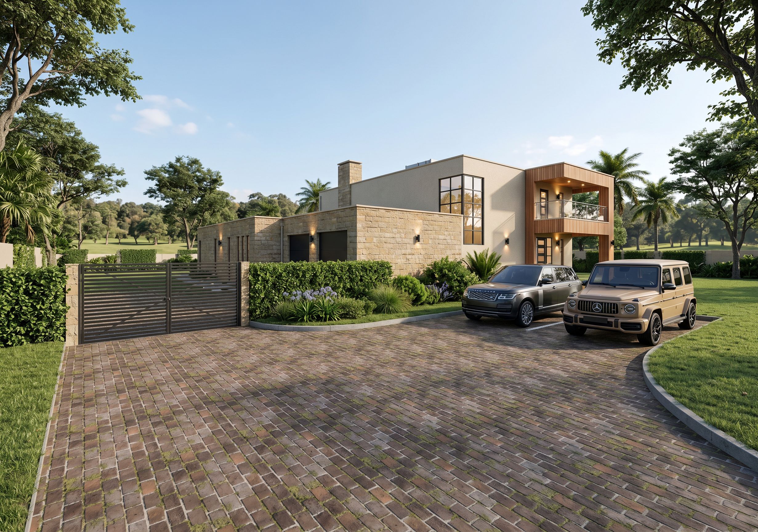 PromptA modern two-story residence features a blend of textured tan stone masonry on the lower level and textured beige stucco on the upper floors. A large black-framed grid window and a matching stone chimney define the main structure, while the right side of the house includes a recessed balcony finished in warm vertical wood cladding. In the foreground, a weathered cobblestone driveway leads toward a dark metal gate and a lush green hedge. Two luxury SUVs are parked near the house. The building is surrounded by a vast lawn of green grass and mature trees under the bright sunlight of a clear day. Natural daylight fills the scene under a clear sky, with realistic sun direction casting soft, accurate shadows across walls, paving, and landscaping. Exterior wall lights and balcony soffit downlights are switched on, emitting a warm glow that contrasts subtly with the daylight, while interior lighting is faintly visible through the glazing for depth. Enhance the landscaping with lush green bushes and low shrubs placed around the footprint, complemented by neatly maintained lawn areas and a few taller ornamental plants near boundary walls. Vegetation should feel tropical, balanced, and well-scaled, with gentle leaf shadows adding realism. All materials should display high-resolution textures and subtle imperfections, with realistic glass reflections and accurate global illumination. The overall mood is calm, refined, and premium, suitable for high-end residential marketing, with no people visible and a clean, magazine-quality finish. Turn on interior lights and the two-way exterior wall lights. Keep the exact camera angle., keep exact camera angle