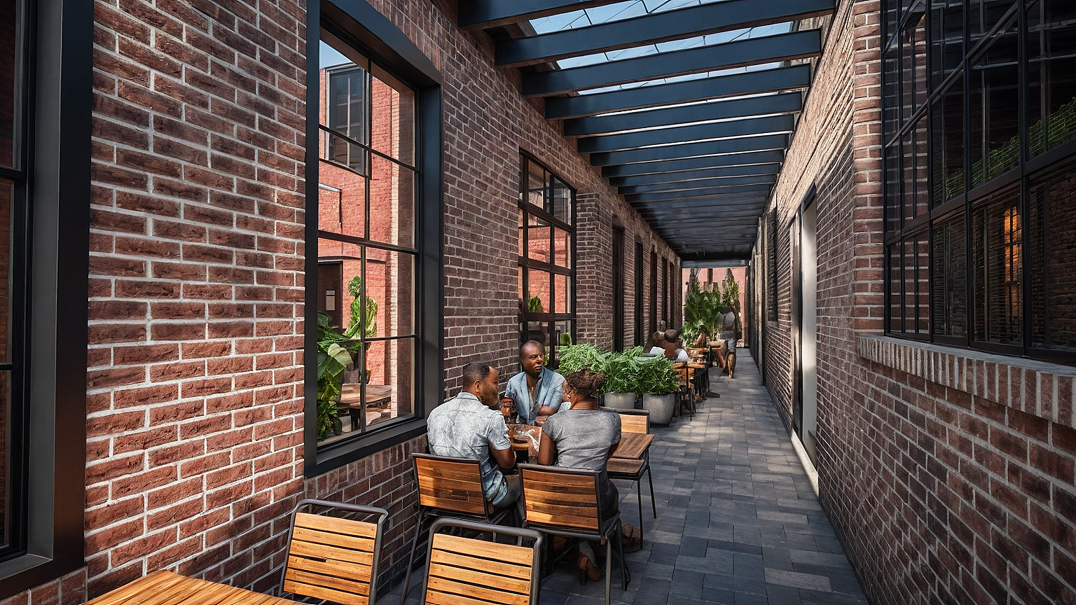Outdoor alley seating dining for Jamaican restaurant, modern, industrial, worn brick, wood rafters, skylight, industrial vibes, modern, bright and vibrant.