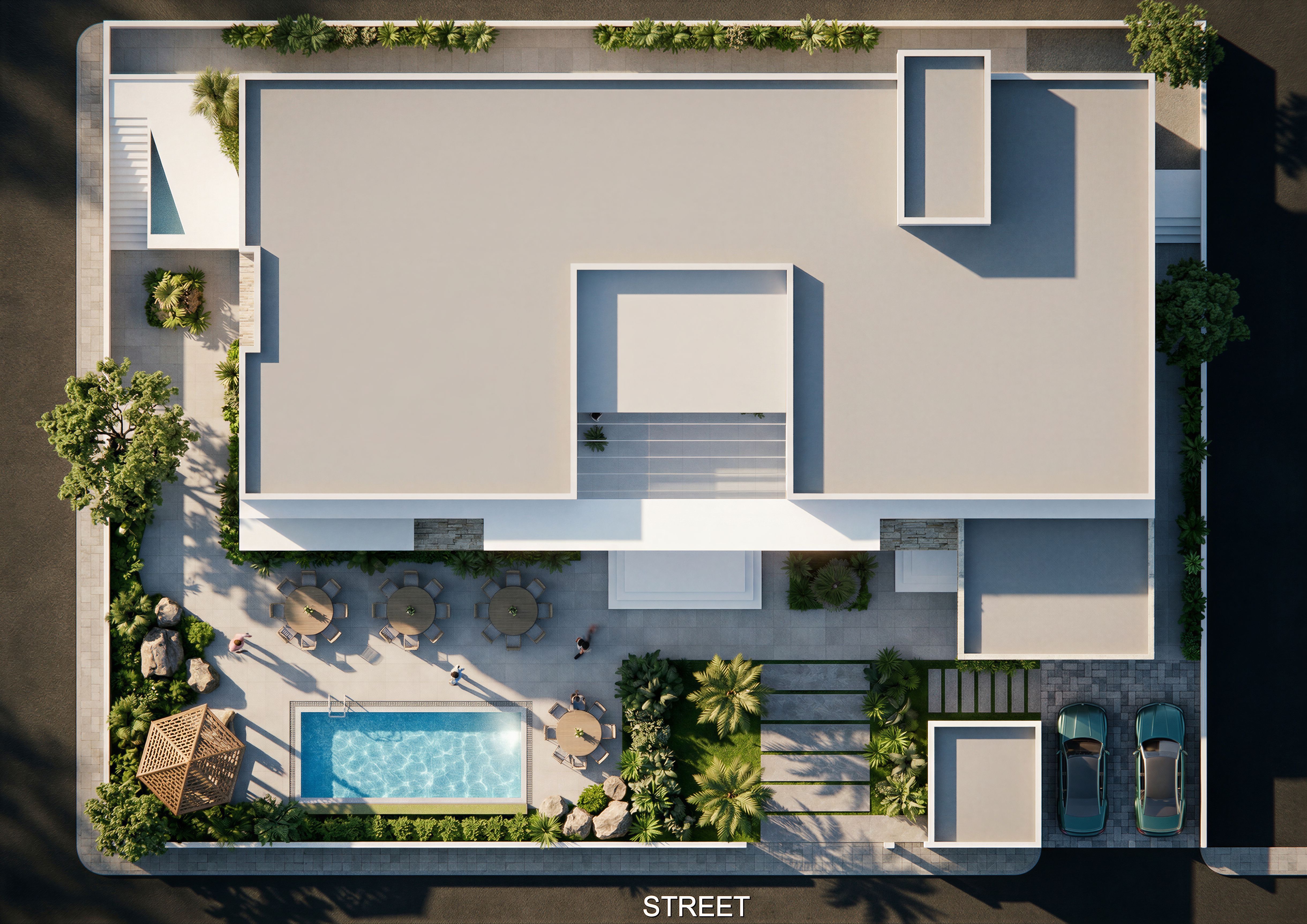 الصورة لموقع عام فيلا فاخرة واحتاج اخراج التصميم مع النباتات الطبيعية و الاشجار علما انني وضعت في التصميم مظلة خشبية في الزاوية على شكل مثمن واحتاج التصميم مع الظلال ولا تضع قرميد في الاسطح ولا تضع مناطق خضراء سوى في المناطق المشار لها في المخطط مع الاتزام بتفاصيل التصميم, keep exact camera angle