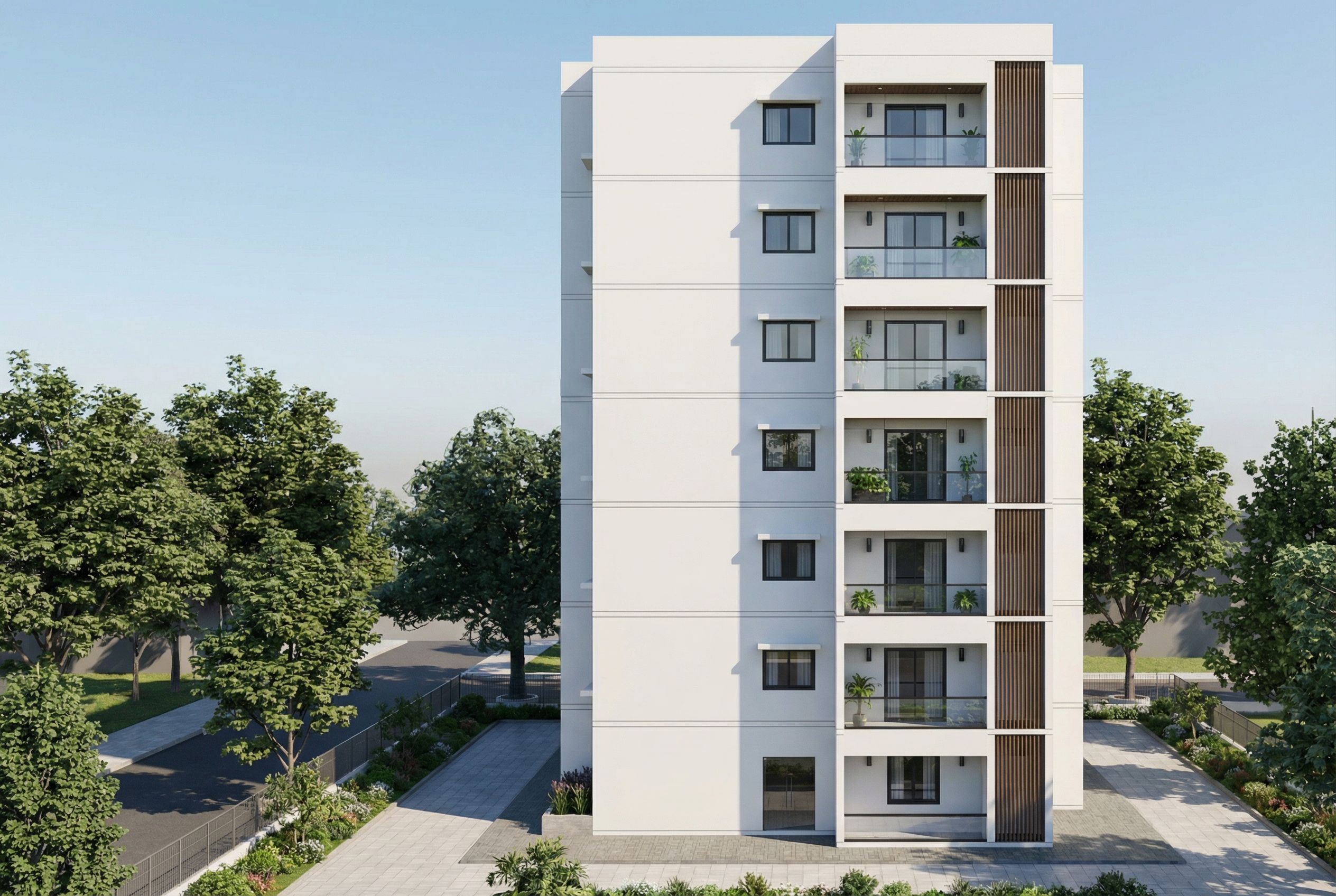 Promptarchitectural exterior rendering, render this photo into photorealistic rendering, Photo of a modern residential apartment building with a clean, angular facade. Highlight the crisp white exterior, large glass balconies with planters, and textured vertical slats for visual interest. The structure is surrounded by lush greenery, with mature trees providing a peaceful urban setting. Capture mid-morning sunlight casting soft shadows, enhancing the building's features. The perspective is straight-on, emphasizing the height and symmetry of the building, with a wide-angle lens to incorporate the surrounding landscaping and walkways., keep exact camera angle, high quality, professional, detailed scene