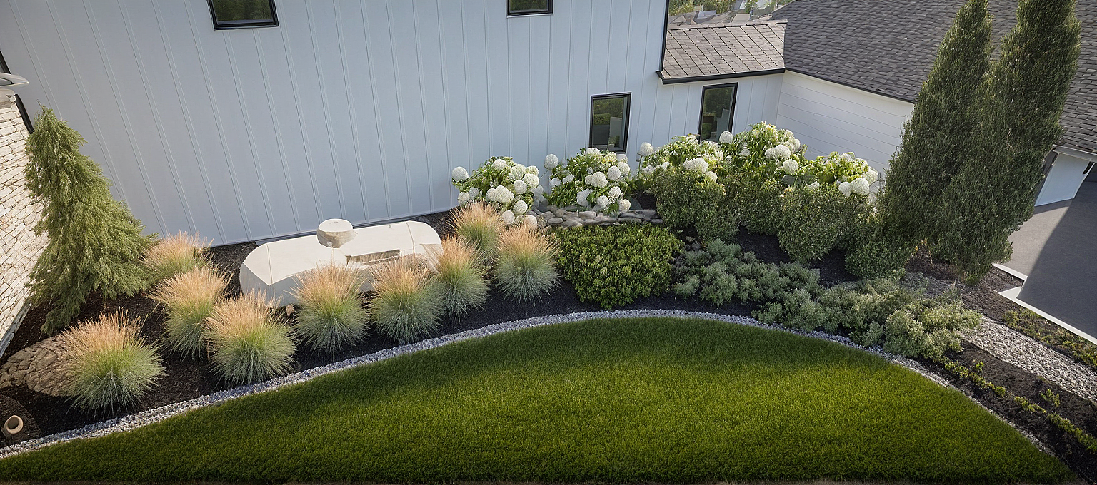 White siding, cedar columns, concrete patio, gravel driveway, turf lawn, limestone retaining wall, perennial grasses, juniper trees, Russian sage, hydrangea, river birch, dry bed, boxwoods