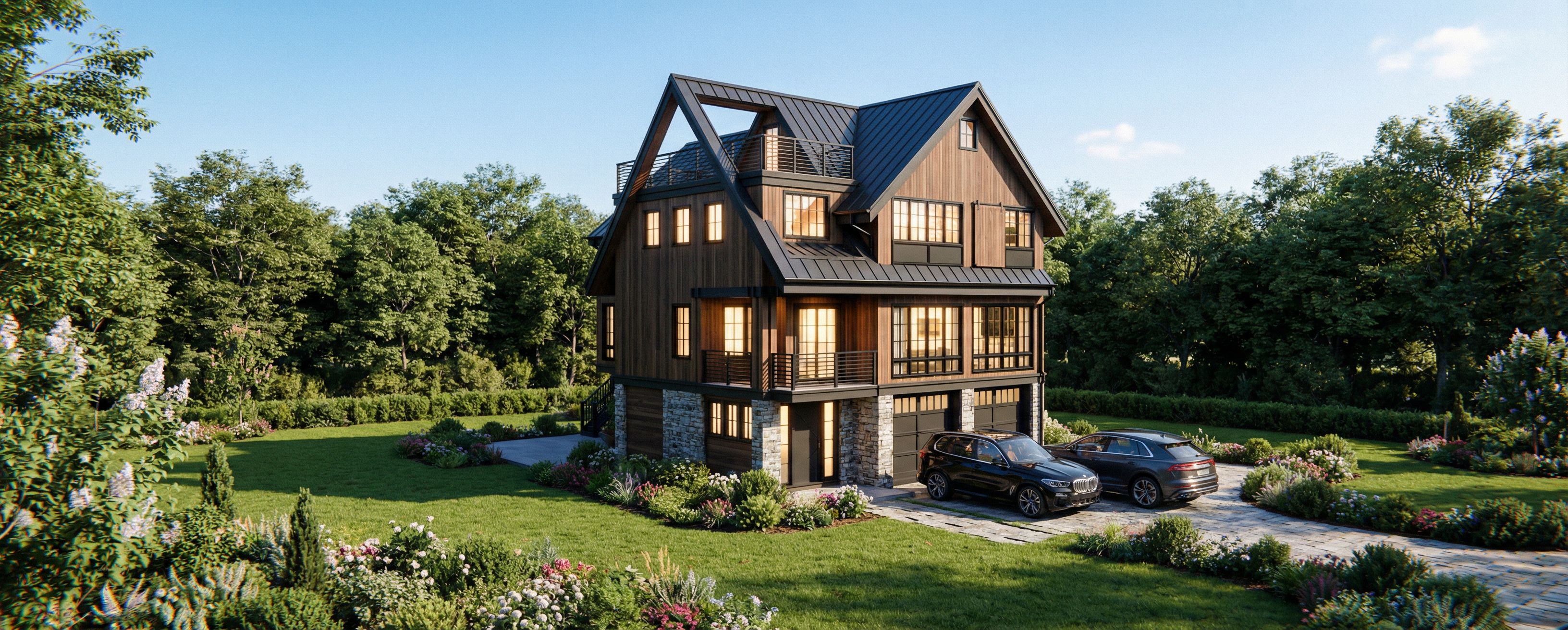 CREAR RENDER HIPER REALISTA . DIA SOLEADO, CIELO AZUL. CONSERVAR EL PUNTO DE VISTA EXACTO. ADICIONAR LUZ TENUE EN EL INTERIOR DE LA CASA. ADICIONAR UN BMW X5 Y UN AUDI Q8 EN FRENTE A LOS GARAGES. ADCIONAR UN BACKGROUND CON ARBOLES. ADICIONAR BELLOS JARDINES. PROPONER ACABADOS MODERNOS , keep exact camera angle
