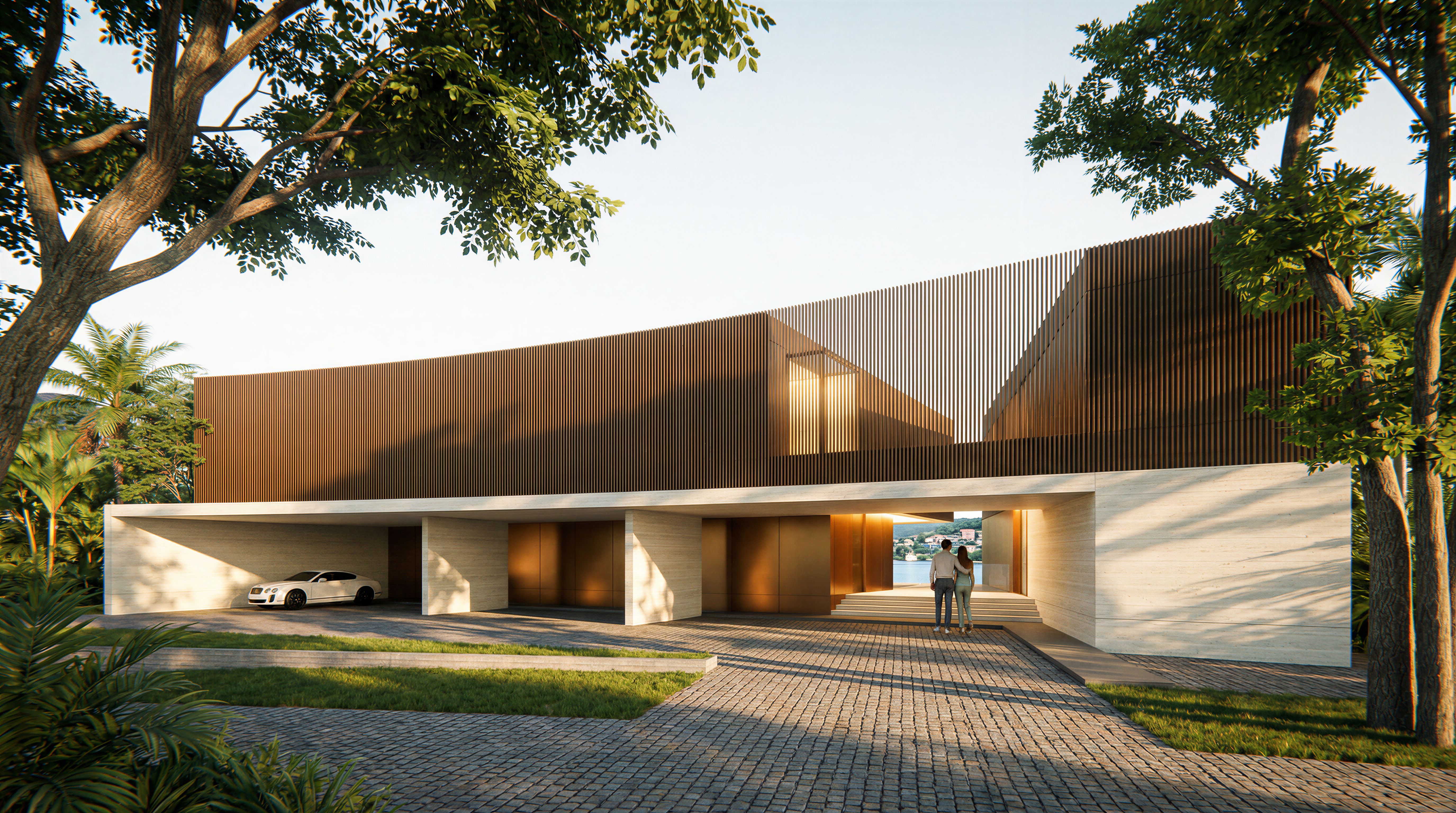 EnhancedPromptA photorealistic architectural rendering of a massive, ultra-minimal luxury curved residence based strictly on a reference SketchUp image for design, camera angle and image proportion. The facade features a sophisticated blend of White Travertine stone slabs on the ground floor, while the upper level is wrapped in continuous, sweeping vertical Bronze aluminum slats following a graceful curve. A two-bay garage is situated on the bottom left, featuring a white Bentley parked in the leftmost bay facing out, with the interior garage wall clad in sleek Bronze panels. To the far right, a grand entrance with a 4-step staircase leads upward. At the top of the stairs, a stylish Korean celebrity-like couple in casual attire stands with their backs to the camera, gazing through a tall, narrow architectural void toward a distant lake and a hillside village. Warm golden evening light spills from a skylight, grazing the interior bronze walls. The environment is lush with tropical greenery and large architectural trees. The driveway is paved with long, narrow rectangular cobblestones in a running bond pattern. The scene is captured during the golden hour with deep, elongated shadows. In the foreground, sunlight filters through the intricate branches of large trees, casting dappled shadows across the grass, the road, and the house. High-end cinematic lighting, serene and luxurious atmosphere.