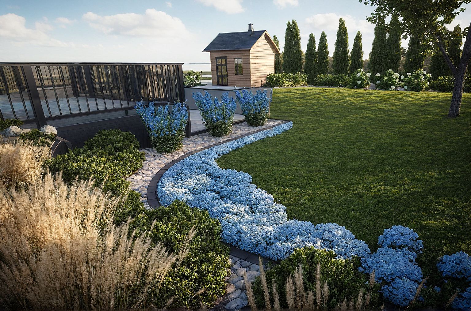 Promptmake this photo realistic, boxwoods, lawn, river rock, reed grass, blue hydrangea, liliturf, deck, tan house