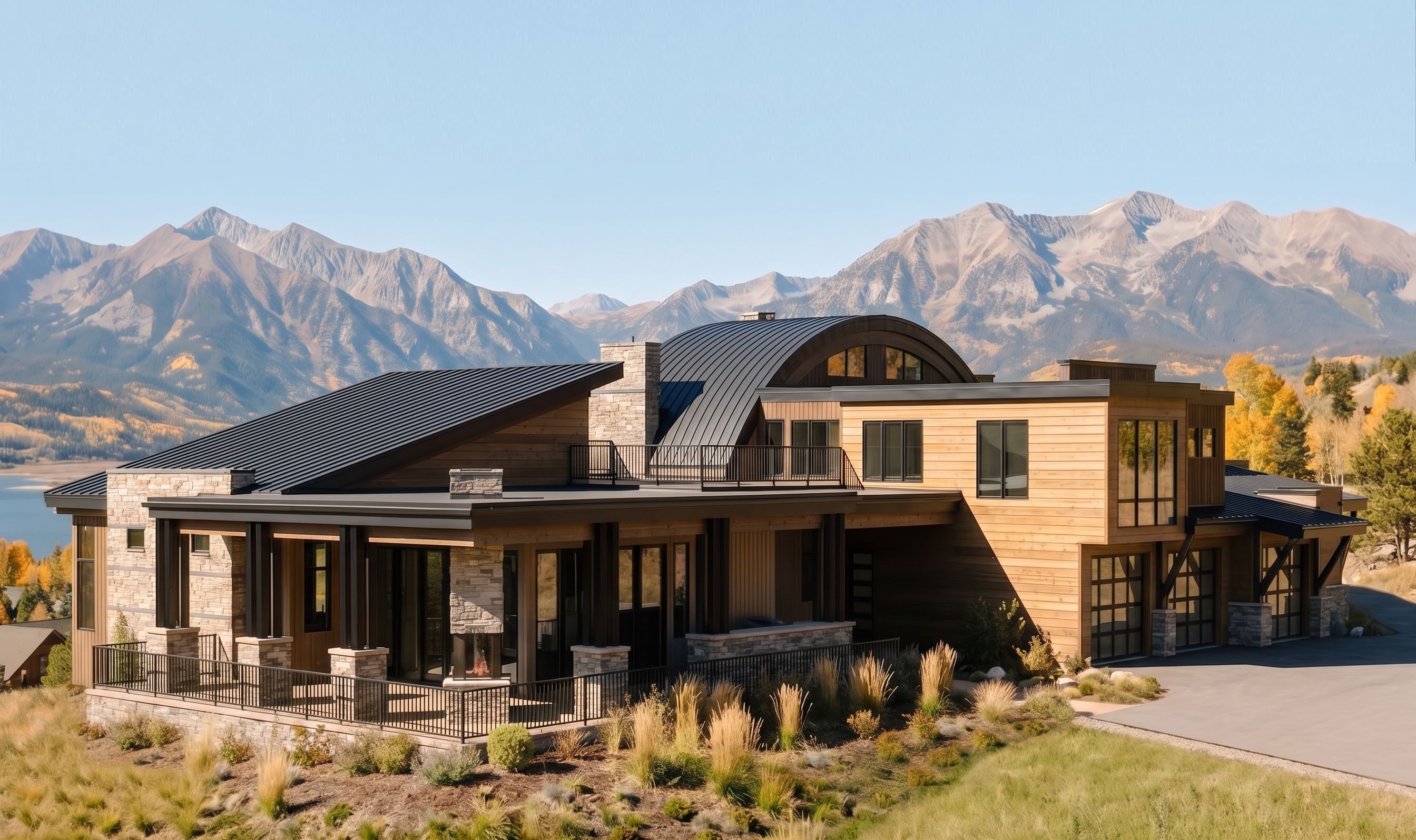 PromptLOWER THE POINT OF VIEW SO YOU ARE NOT LOOKING DOWN ON THE HOUSE as its shown. i dont want to see so much of the flat roof so it should be more at human eye level and not looking down on the house. SAME marerials. make the horizontal wood have a little more pop and brightness. keep the BAckground and landscaping the same. do not show a driveway at the bottom of the image just continue the lawn. keep the driveway in front of garage as shown in the image. make the columns and brackets dark steel.