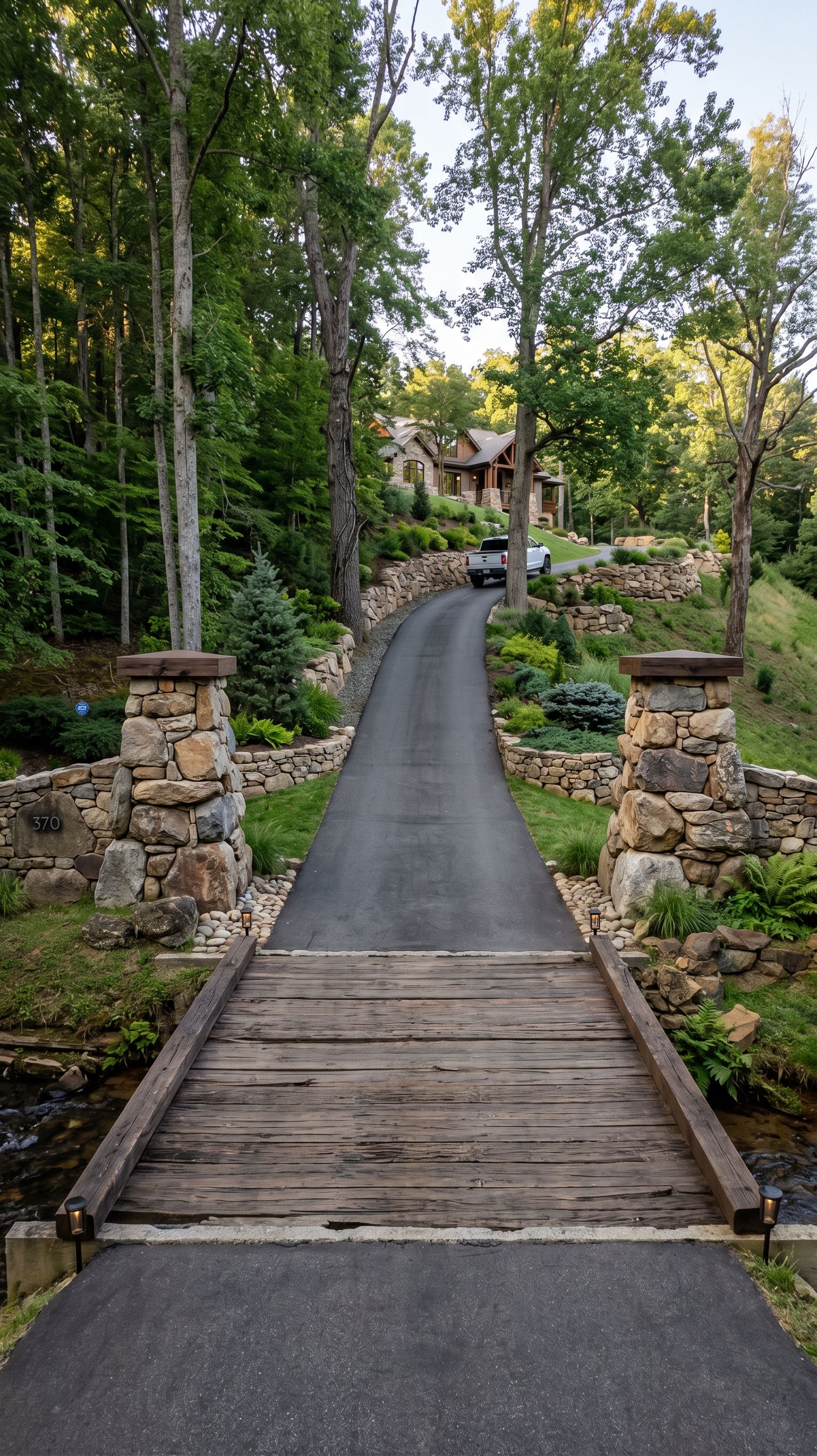 this is my driveway. add a rock column on each side of the drive and make this entrance a mountain home grand entrance , keep exact camera angle
