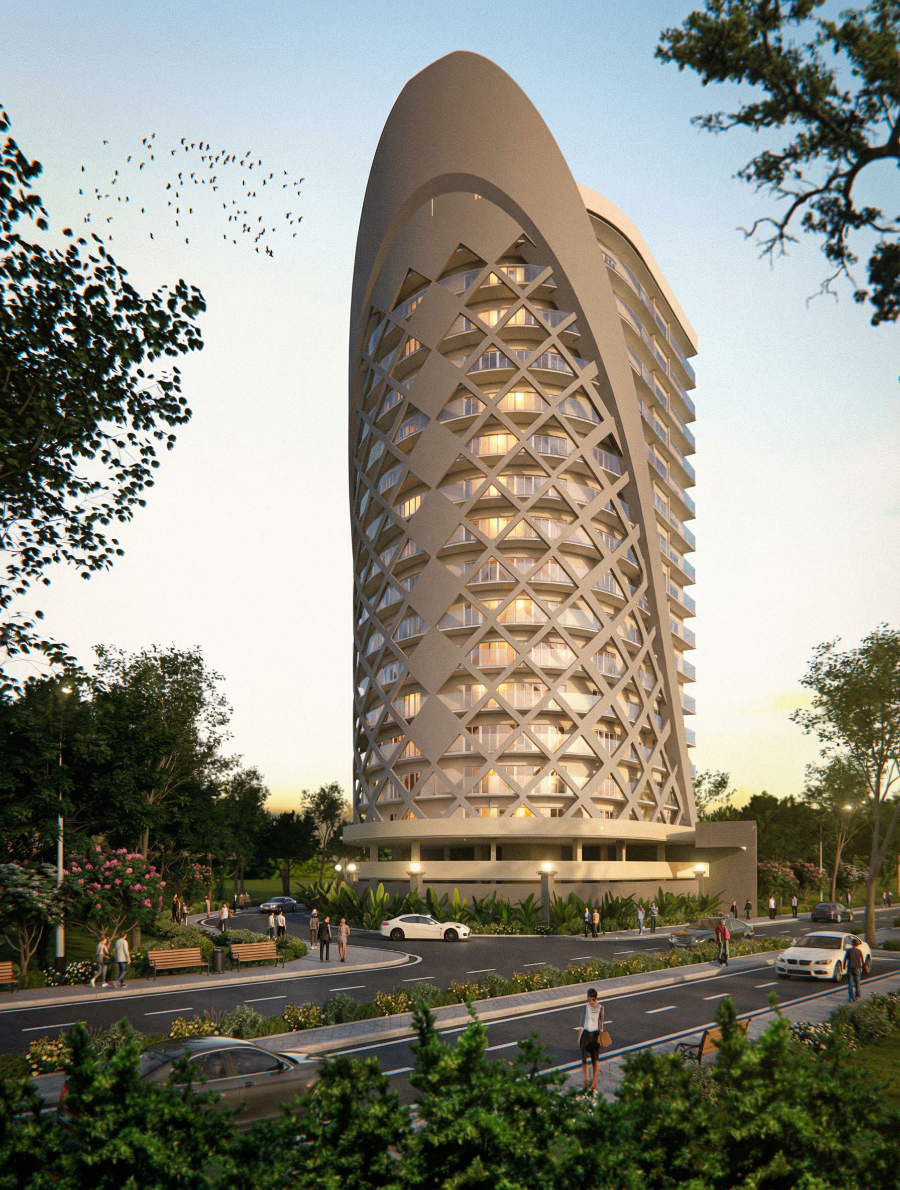 PromptExterior image showing a building between two roads with curtain walling and some birds in the sky. Make glass reflective clear and realistic. Turn lights on in the building., keep exact camera angle