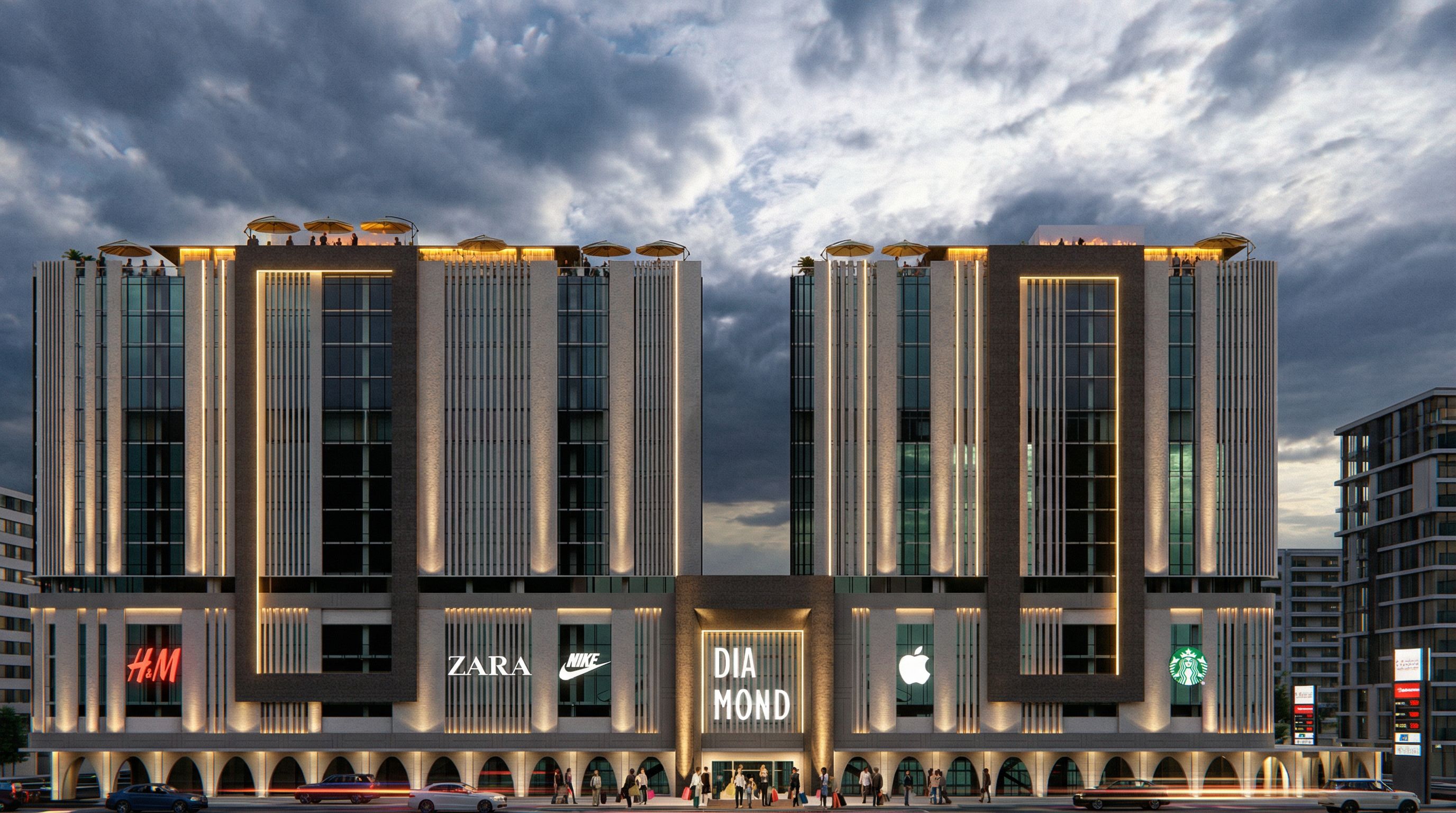 PromptPhoto of a modern commercial building featuring sleek glass and concrete façades, emphasizing vertical lines and a striking entrance with illuminated signage. Surrounded by a bustling urban landscape, with adjacent structures enhancing the city vibe. Captured during twilight, showcasing dramatic cloud formations and reflections on glass surfaces. Shot from a straight-on perspective with a wide-angle lens to enhance scale and depth, highlighting architectural details and textures within the composition. and the podium is a commercial center (mall) add to the elevation the some large logos of clothes brands with light behind add linear lights and add people enjoying shopping at the entrance and there are restaurants on the rooftops but without changing the architecture , keep exact camera angle