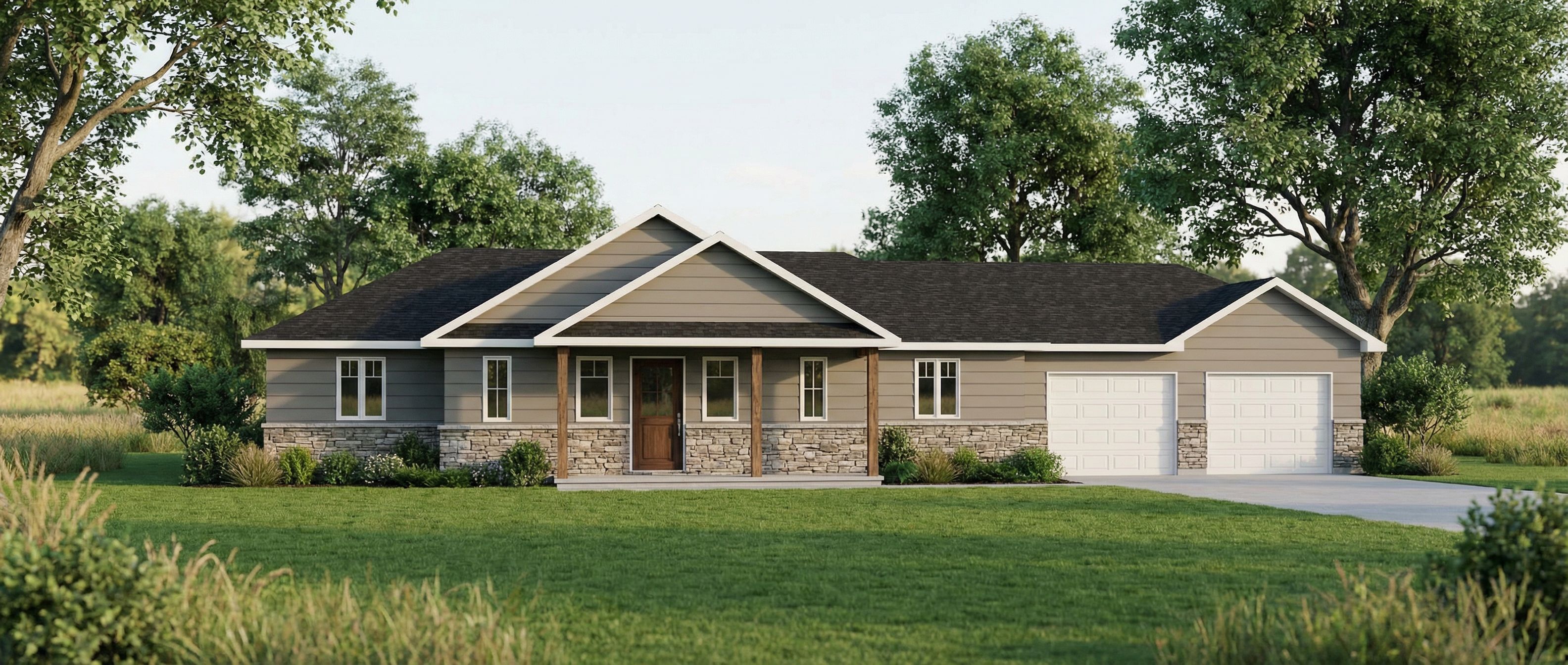 architectural exterior rendering, render this 3D mass into photorealistic rendering, Photo of a single-story residential home featuring a blend of siding and stone materials, with a prominent sloped roof design. Architectural details include large, evenly spaced windows, a central entrance flanked by wooden columns, and a textured stone base. Surrounding the house, an open urban landscape with A FEILD AND TREE SETTING, MANICURED LAWN, Soft, natural daylight enhances surface textures, casting gentle shadows. Captured from a frontal perspective with a slight upward tilt, simulating a 35mm lens for depth and clarity., keep exact camera angle, including greenery and vegetation, trees, high quality, professional, detailed scene