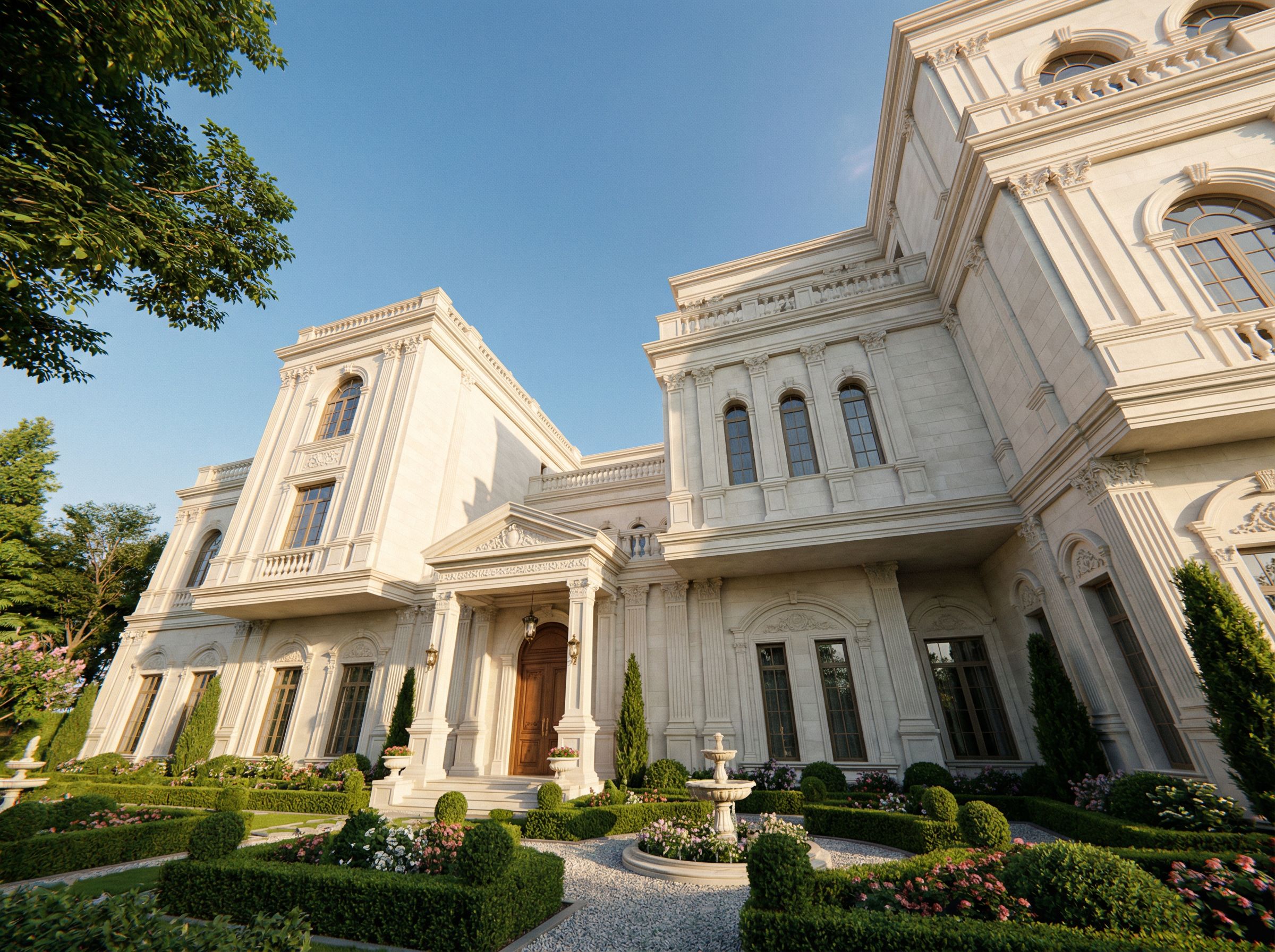قدم تصميم للبمنى بطراز يحمل سمات الباروك مع تخفيف الحفى عى الحجر , استعمل الحجر الجيري الابيض وقدم تصميما للحديقة أمام البمنى, اجعل المدخل بارزا للامام , keep exact camera angle