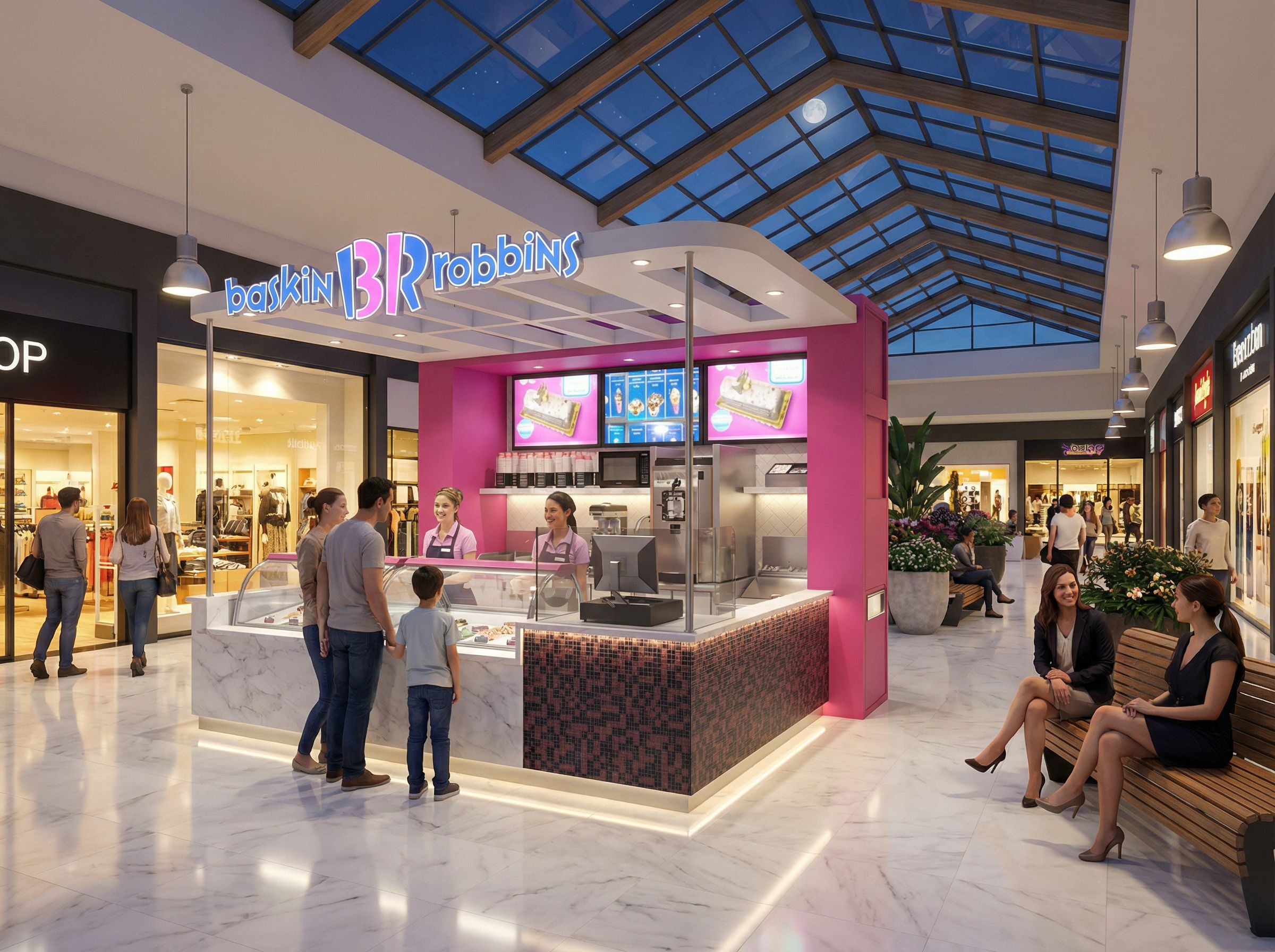 interior design rendering, render this sketch into photorealistic rendering, Stand de Baskin Robins en destaque con la barra de pastillas de vidrio y marmol en una plazoleta de un centro comercial, tiendas de todo tipo alrededor, gente de todas las edades caminando. bancos modernos con lindas mujeres sentadas. macetas grandes con arbustos y flores, piso en marmol blanco brillante. techo de la plazoleta en vidrio con estructura de madera y lamparas colgantes modernas, exterior de noche con luna clara. logo de baskin robbins con luz interna, stand con 2 mujeres bella atendiendo y una pareja con 2 chicos comprando, Menu del stand retroiluminado. electrodomesticos del stand en acero inoxidable brillante. buena iluminacion, keep exact camera angle, high quality, professional, detailed scene
