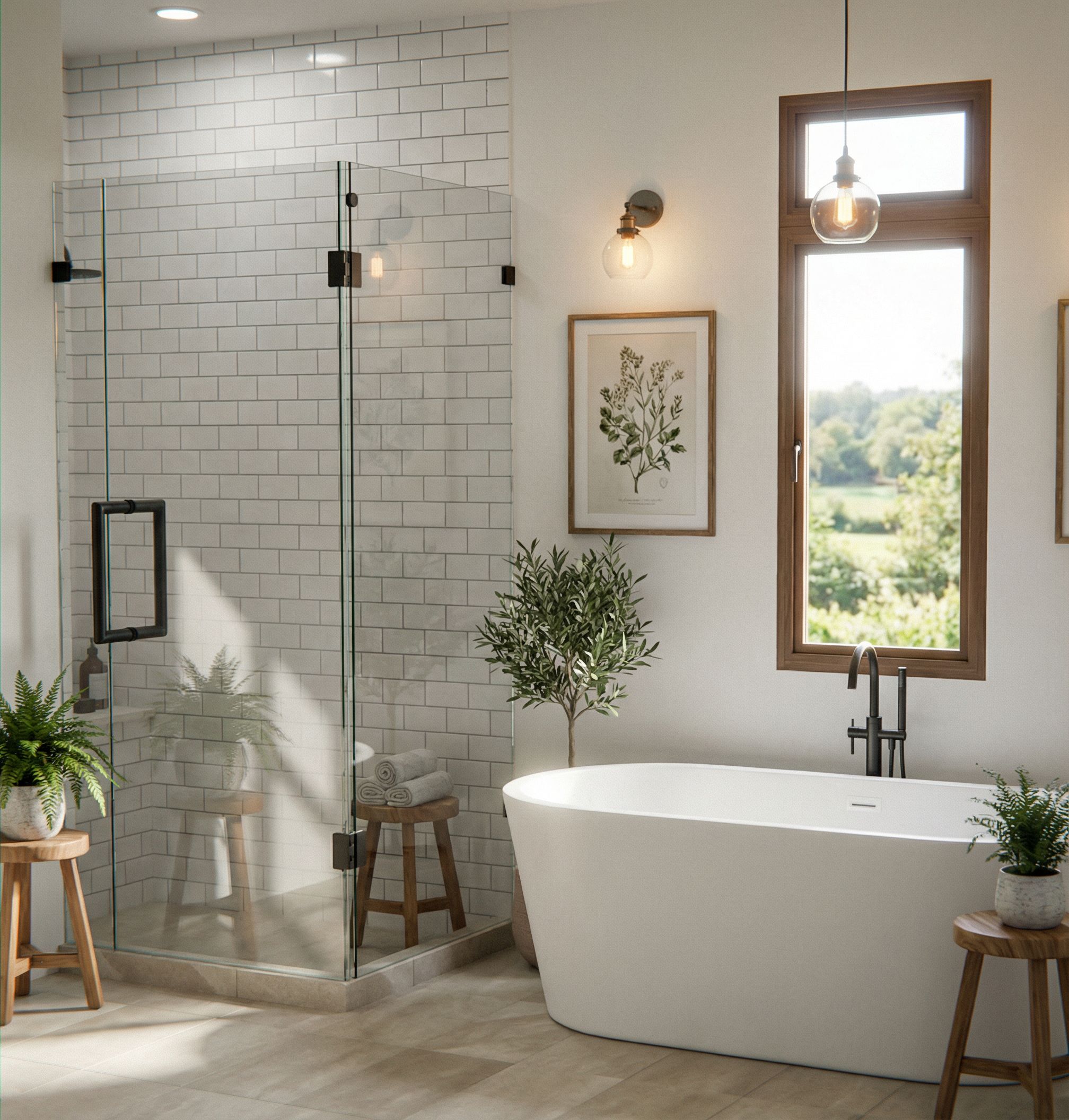 PromptPhoto of a modern bathroom featuring a sleek glass shower enclosure and a freestanding bathtub. Highlight the clean lines and minimalist design elements, focusing on the smooth textures of tiles and the contemporary materials used. The environment should reflect a serene COUNTRY setting with soft, natural lighting filtering through a window, casting gentle shadows. Capture the scene from a slightly elevated angle using a wide-angle lens to emphasize the spaciousness and sophistication of the layout. BROWN WINODW, keep exact camera angle