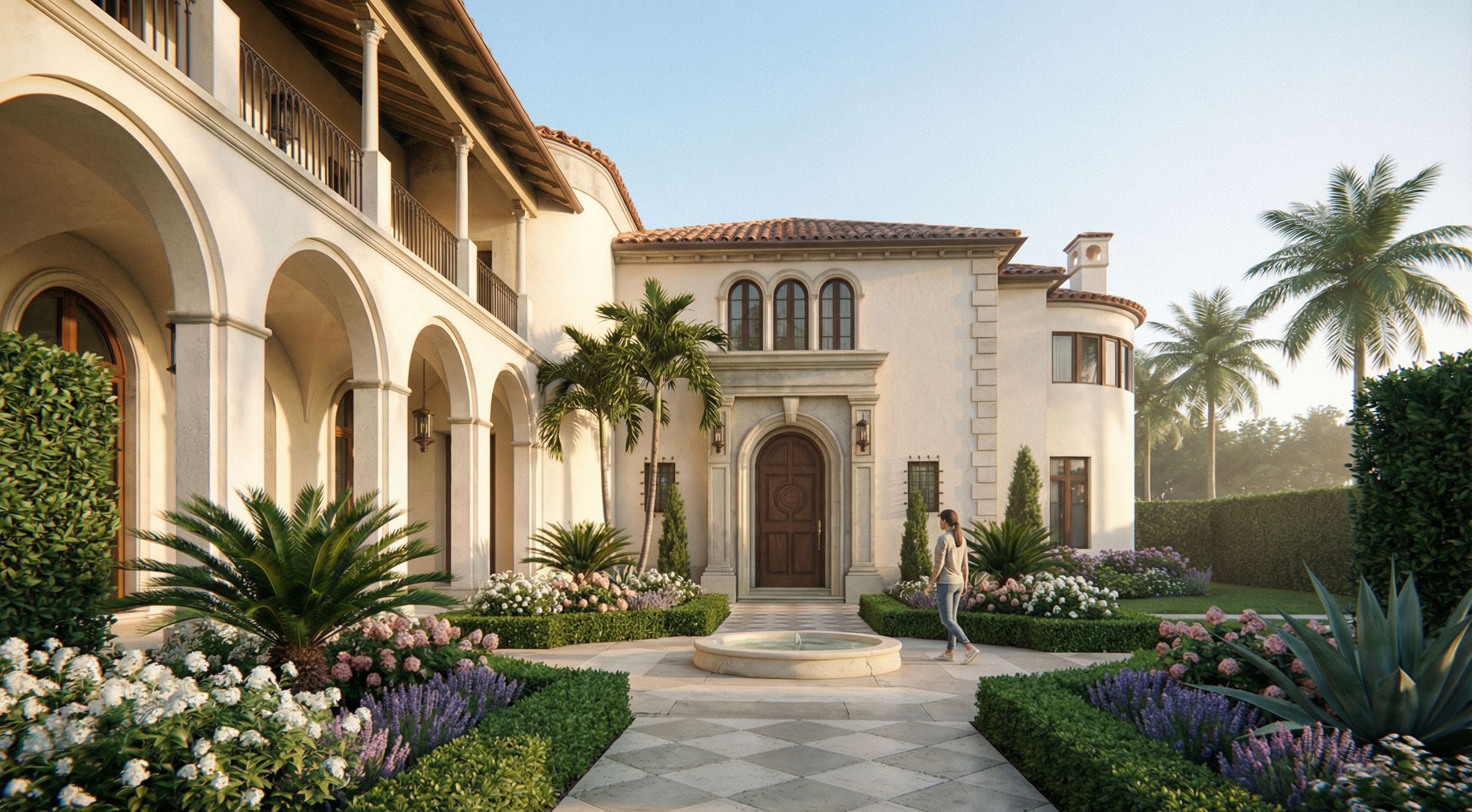 Promptchange only what i say. can you add in a person for scale. to size the person the front door is 4ft wide by 10ft tall. maybe have the person sitting by the fountain or they are walking off into the garden the main front door should remain the focus point not the people they are only added for lifestyle enhancement. , keep exact camera angle
