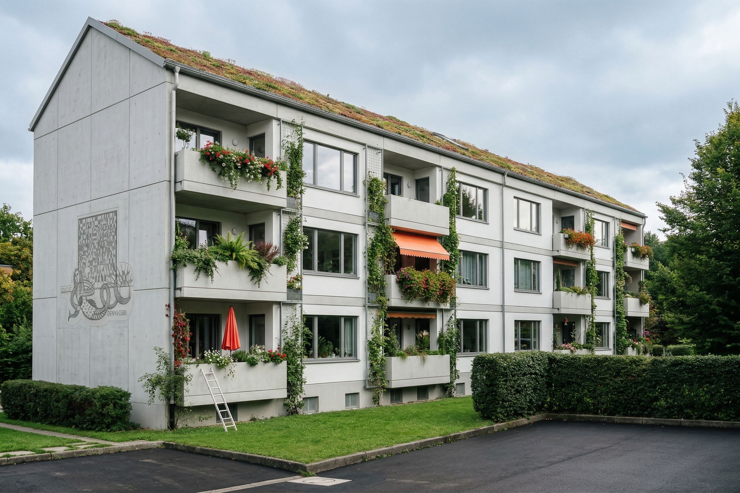 PromptModern, minimalistic, dont change angle of the original photo, add greenery on facade, should represent a passive house, keep exact camera angle