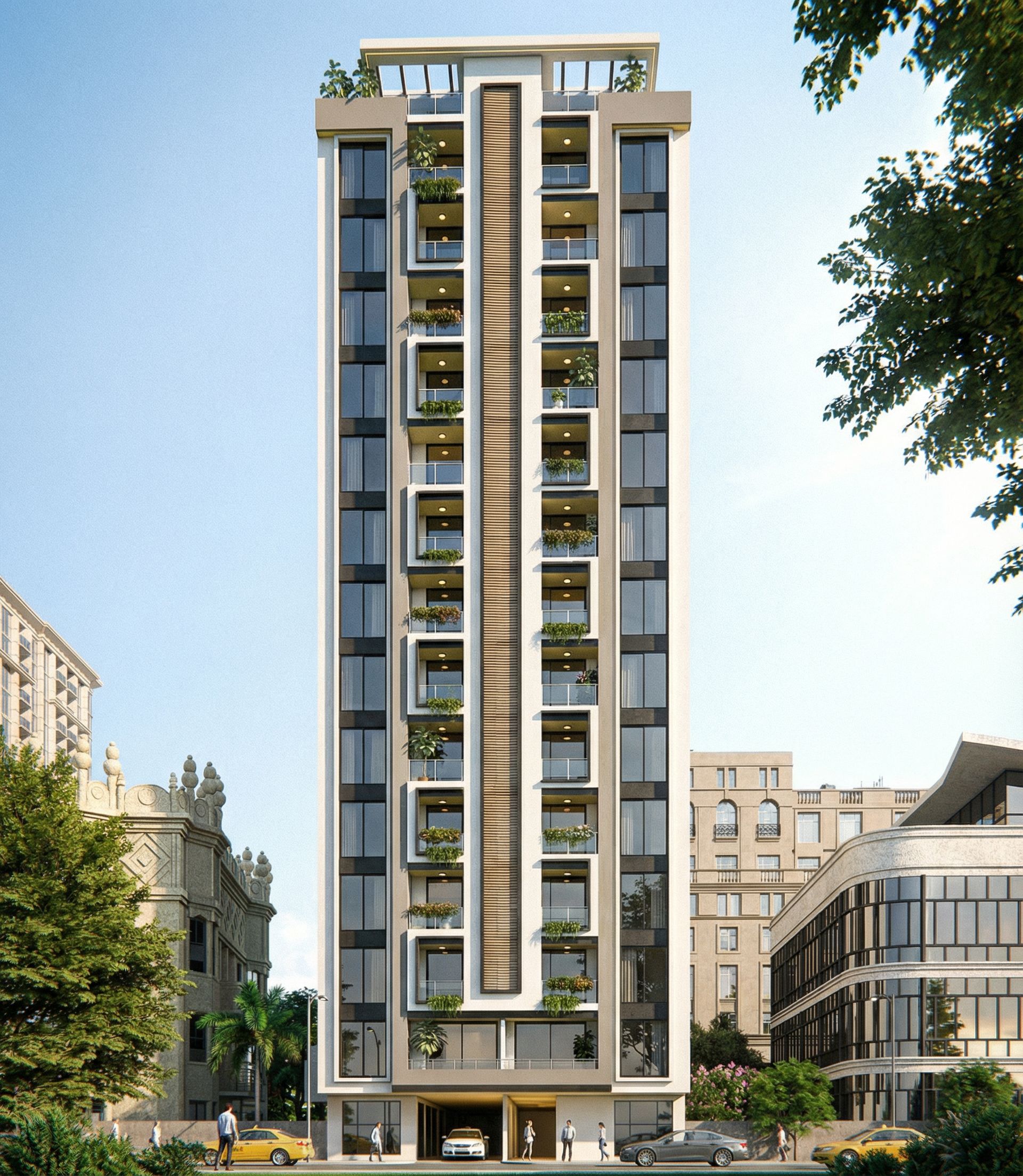 Photo of a modern residential high-rise building, featuring sleek glass facades and defined horizontal lines. Architectural details include balconies with planters and an elegant entrance. Set in an urban environment surrounded by historical and contemporary structures, with lush greenery at the foreground. Soft evening light casts gentle shadows across the facade, enhancing texture contrasts. Captured from a slight low angle, emphasizing height and grandeur, with a wide-angle lens to encompass nearby buildings and vibrant street life., keep exact camera angle