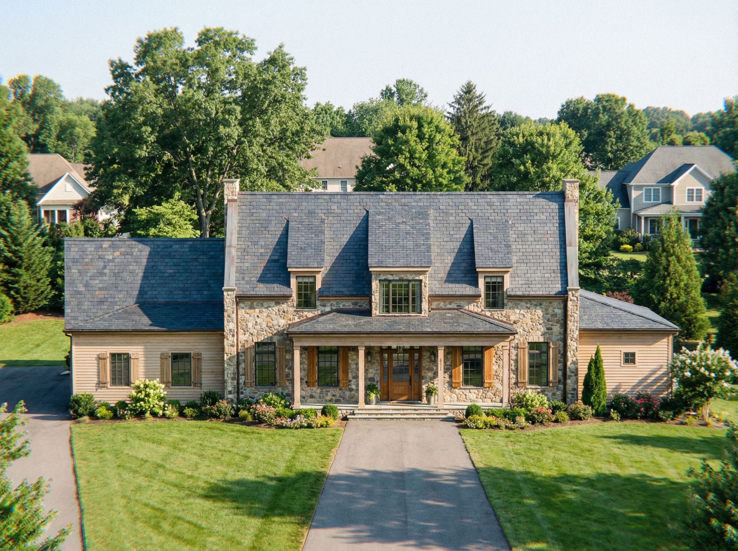 PromptPhoto of a contemporary family home featuring a stone facade and pitched roofs, complemented by large windows. Sloping parapet walls. The design showcases natural materials with textured stone and wood accents. Situated in a suburban setting surrounded by lush greenery, with neighboring houses in the background. Soft, natural daylight enhances the architectural features, casting gentle shadows. Captured from a straight-on angle, the perspective emphasizes the entryway, framed to highlight the welcoming porch., keep exact camera angle