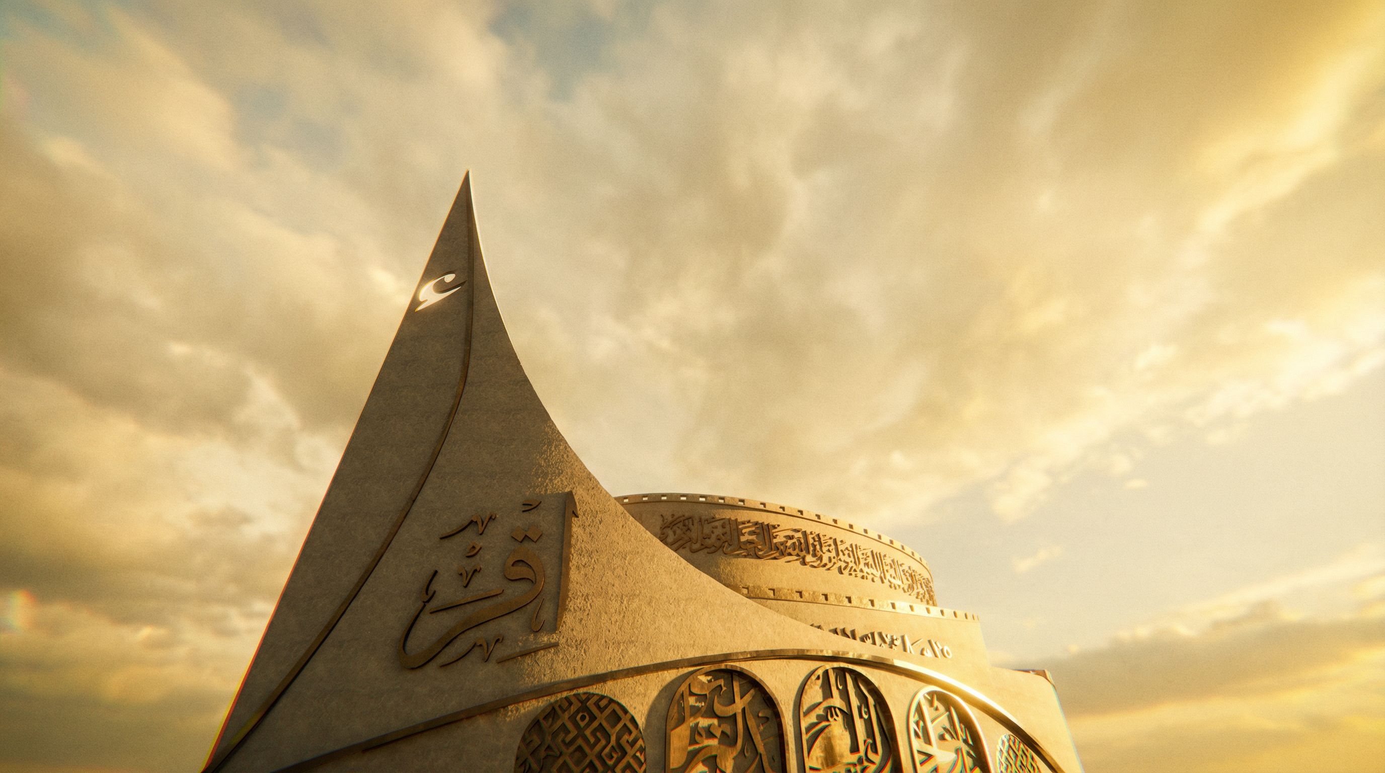 Photo of an innovative Islamic cultural center, showcasing a unique geometric design with a soaring pointed roof and intricate calligraphic details. Set against a vibrant urban skyline, Dramatic natural lighting illuminates the structure, accentuating textures and shadows. Captured from a low angle, with a wide lens to emphasize the height and form of the building, creating a dynamic and inspiring architectural visualization. don't add any surrounding, keep exact camera angle
