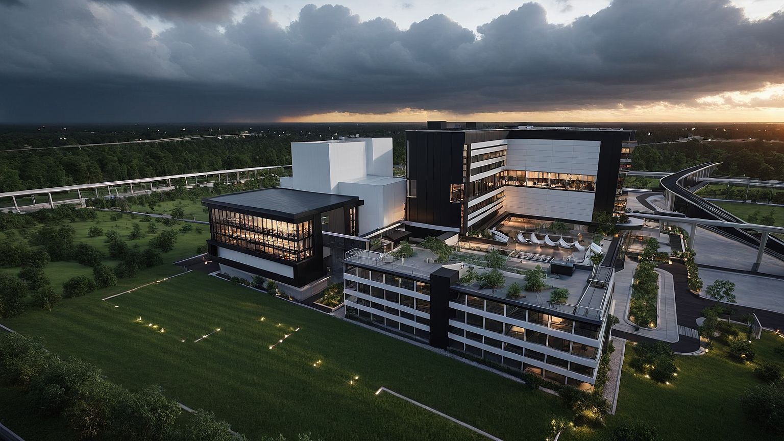 PromptHeavy overcast with rain + sunset + Additional vegetation + Modern building facades + Steel black and concrete finish + lighting + sky rail colour white + lawn grass + white sails for structures