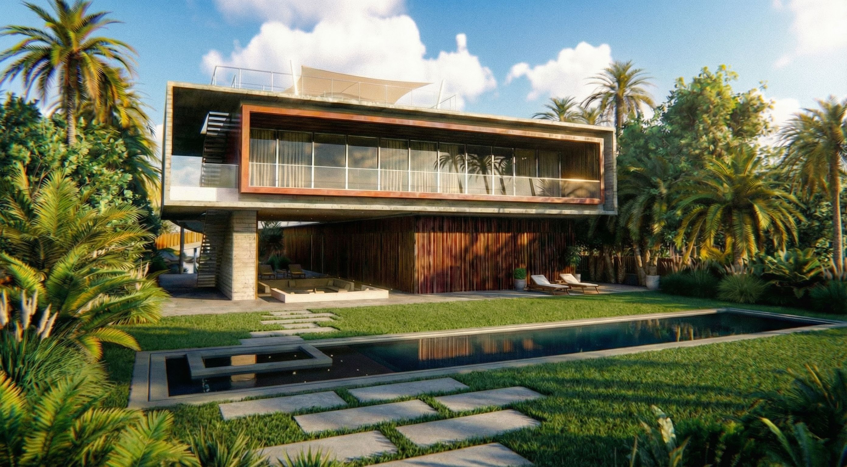 separa un poco más las baldosas del camino hacia la piscina y añade césped entre estas mismas baldosas. apaga las luces artificiales debajo del porche de entrada, keep exact camera angle