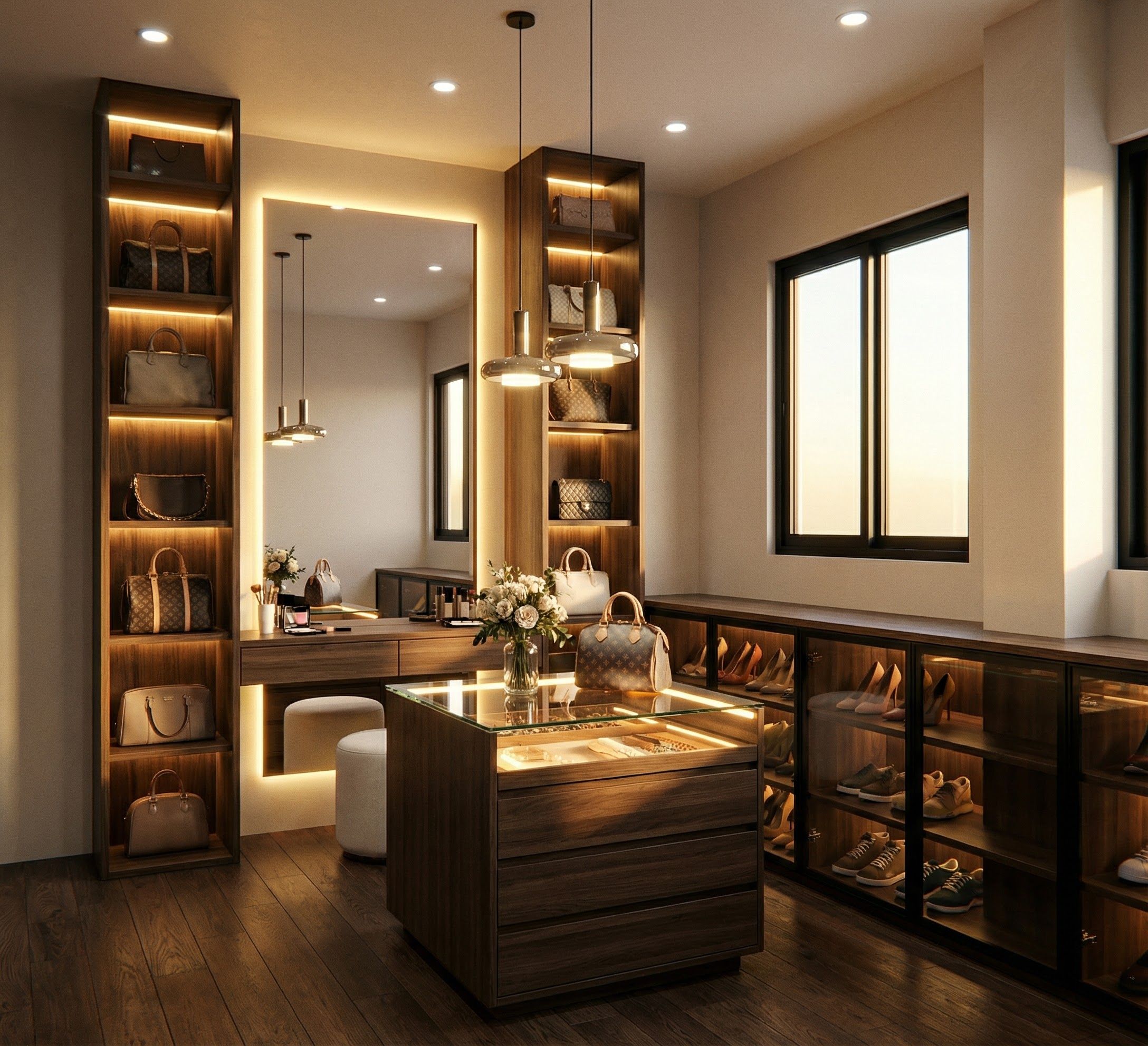 Create an architectural visualization featuring. pequeño vestidor con suelos en madera de roble oscuro y elegante, paredes y techos en blanco. en el medio de la estancia hay una isla con cajones de madera oscura y en la parte de arriba de cristal en el que se puede ver lo que hay en el cajon de debajo, este cajon va iluminado con luz calida. encima de la isla algo de decoracion como un bolso bonito y un jarron con flores. encima de la isla caen dos focos de luz, dos bonitas lamparas modernas y elegantes. en la pared de enfrente hay dos estanterias con un gran espejo entre las dos, las estanterías son de madera oscura con bolsos como de exposicion, cada balda tiene luces led calidas, el gran espejo entre las dos estanterias esta iluminado con luces led, el espejo ademas tiene una tabla de madera a modo de tocador, como la primera imagen de referencia, que va desde un lado de la estantería hasta el otro, ademas tiene cajones como en la primera imagen de referencia, coloca en el tocador maquillaje y un pequeño taburete blanco. a mano derecha hay una ventana con carpinterias en color negro, por la ventana entra iluminacion. debajo de la ventana hay un mueble de estanterias bajo el cual es un zapatero lleno de zapatos, tacones, playeras... este zapatero va cerrado por puertas de cristal con carpinteria en negro, dejando ver los zapatos, cada estanteria esta iluminada con luces led calidas. en el techo ademas hay cos de luz integrados en la pared. sigue mi 3d, con la misma colocacion de los muebles y misma forma.