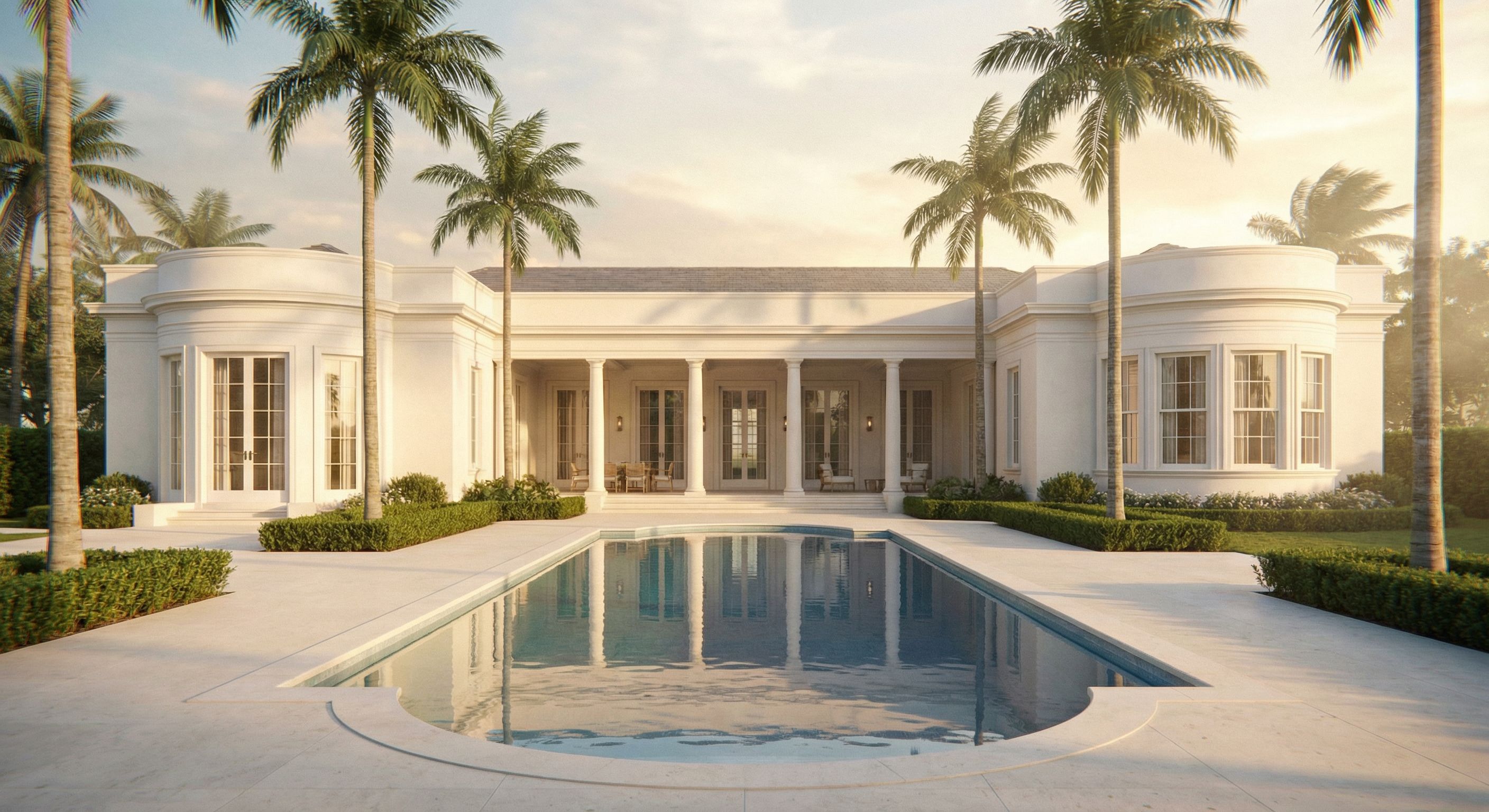 The terrace around the pool is pale limestone or light stone typical of Palm Beach estates. Landscaping is minimal and elegant with a few palm trees and low manicured hedges.
