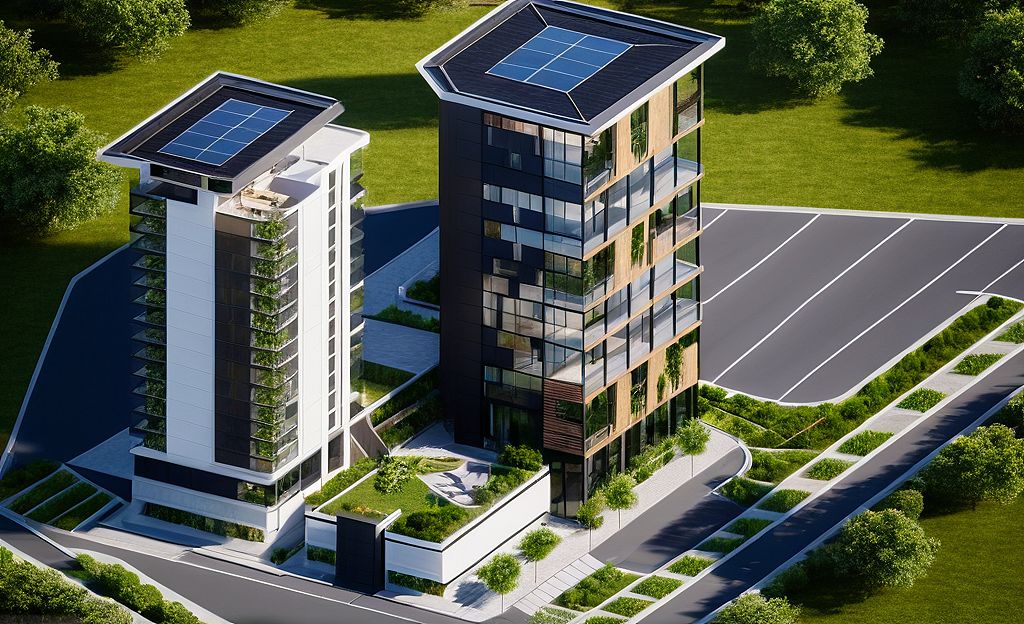 modern contemporary building, with glass and photorealistic texture, ambient warm sunshine with bold and clean lines, the building should be modern, add plants on the balconies and make the glass of the building , place short shrubs and trees only on corner edge of the balcony of the second building, make the glass of the building dark and add contrast on the building to make sure each floor can be seen clearly
