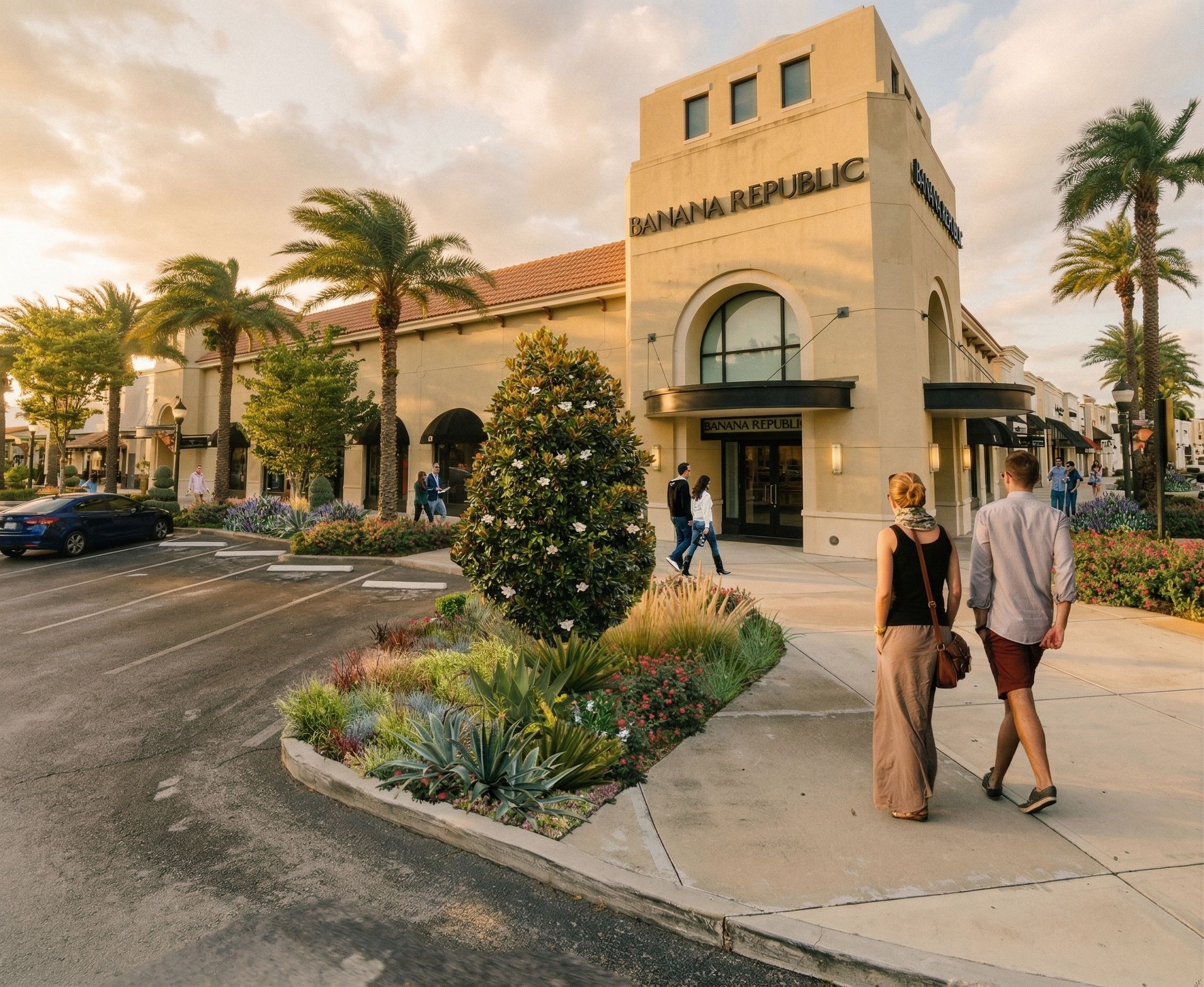 PromptPhoto of a retail building featuring a sophisticated design with a stucco facade and large arched windows, surrounded by palm trees and vibrant landscaping. The urban setting includes a pedestrian walkway and nearby shops. Soft afternoon light casts gentle shadows, enhancing the textures of the building and flora. Perspective from a slightly elevated angle, focusing on the storefront, with a wide-angle lens to capture the lively ambiance and movement of pedestrians strolling by. Keep the camera angle as is., keep exact camera angle