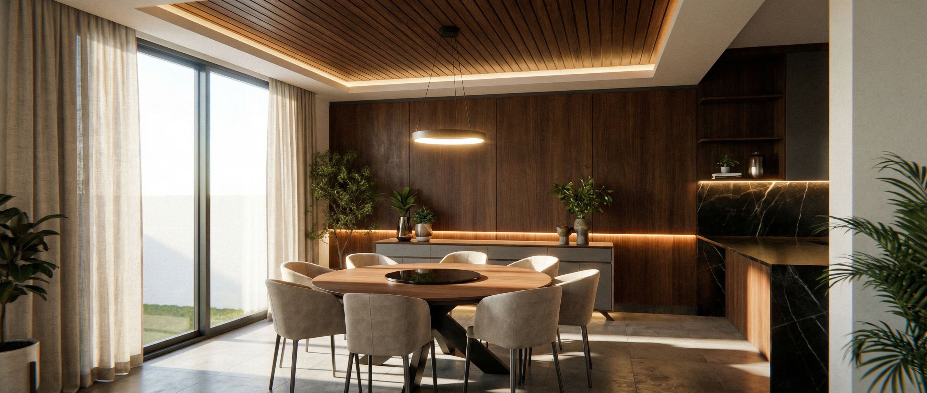 EnhancedPromptPhoto of a modern dining room showing a round wooden table surrounded by elegant upholstered chairs. The walls are adorned with rich wood paneling. Bright natural light flows through large glass windows, casting soft shadows throughout the space. Captured from an angled perspective, the scene emphasizes the spacious design with a wide lens, highlighting the intricate textures and finishes, creating a warm and contemporary atmosphere. Add warm color LED lighting in specific places respecting the original image, keep exact camera angle, add curtains in light colors, keep exact camera angle