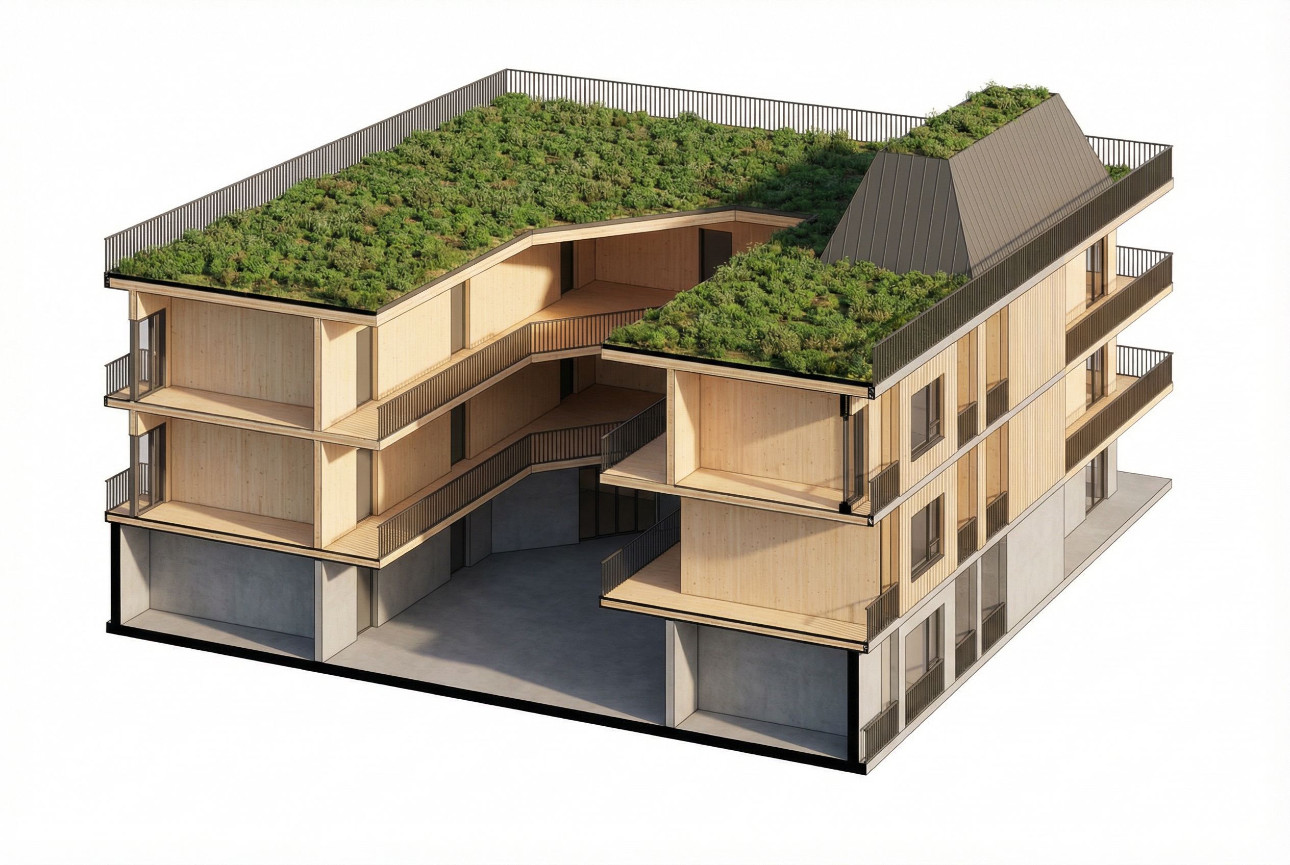 Promptinterior design rendering, render this 3D mass into photorealistic rendering, Render this architectural section exactly as shown in the original Revit export. Do not add any geometry, furniture, walls, floors, ceilings, or landscaping beyond what is visible in the section cut. Do not repair, guess, or modify openings. Preserve all proportions, positions, and dimensions exactly as modeled. Apply realistic materials only to surfaces that are already visible in the cut: Ground floor: smooth gray concrete (Type I). Upper floors: light wood or composite vertical siding. Railings: dark metal. Windows: dark aluminum frames. Floors and ceilings: clean wood structure or CLT where already exposed. Keep everything strictly within the section plane: Do NOT add background buildings. Do NOT fill in missing walls or objects. Do NOT add entourage, furniture, people, or vegetation unless already in the Revit cut. Do NOT extend shadows into areas not present in the section. Style: Use soft, warm natural lighting with gentle shadows for depth. Maintain a crisp architectural graphic look: Thick profile line for cut elements Thin lines for beyond-cut geometry Clean white background No texture distortion Final output should look like a high-resolution architectural visualization that respects the exact Revit section without modifying or inventing any geometry., keep exact camera angle, including people, furniture, high quality, professional, detailed scene